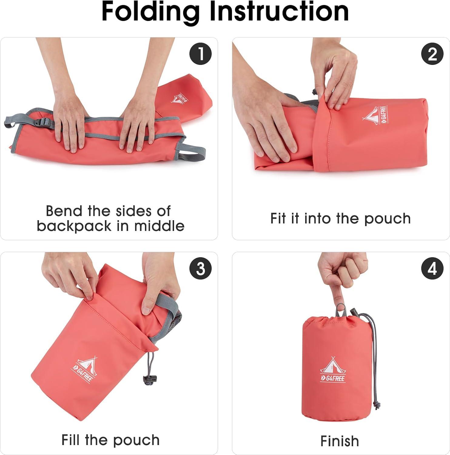 FOLDABLE: This small hiking backpack is easy to fold up into its pocket. Unfold size: 16.5×10.2×5.1 inches. Folded size only 6.7 x 7.5 inches, easily pack it in your suitcase, backpack, or car and simply unfold from your checked bags and use it as a carry-on for your excess baggage to avoid the overweight charge.