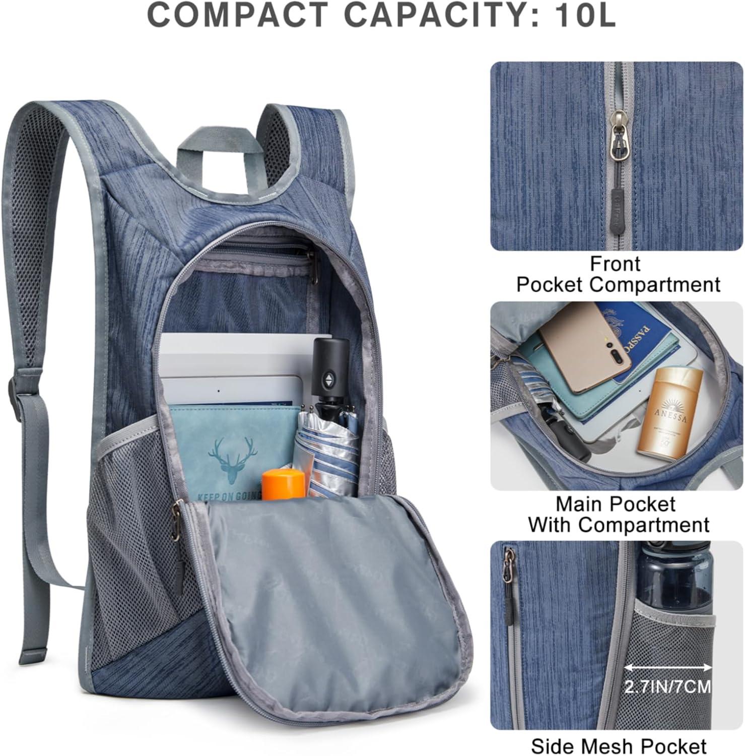 【Large Capacity & Multi Compartment】 This hiking daypack features one main zipped compartment, one zipped front pocket and two side mesh pockets. The travel backpack with 10L capacity can carry daily essentials and keep things organized. It is also an ideal choice for international travel at the airport.