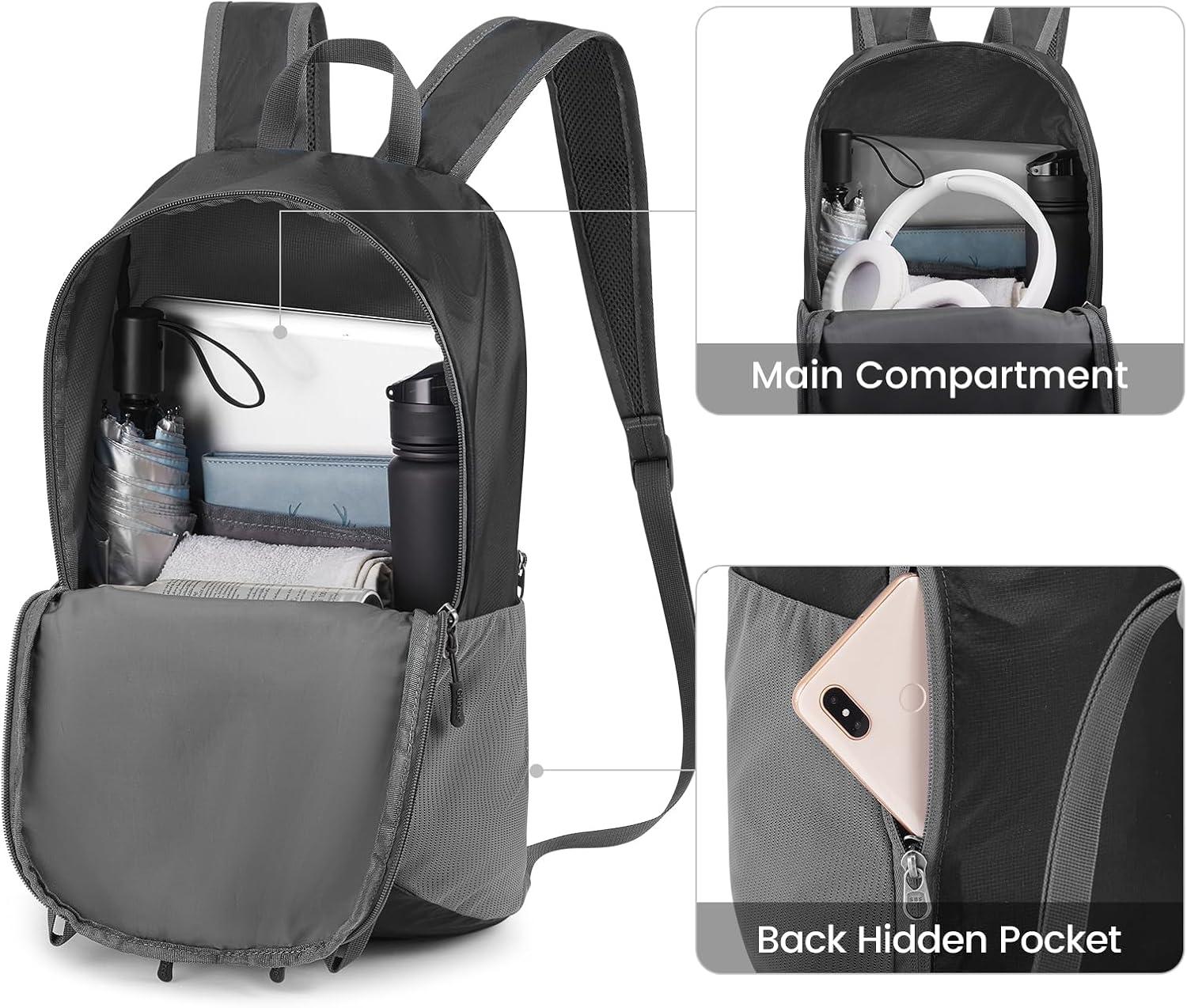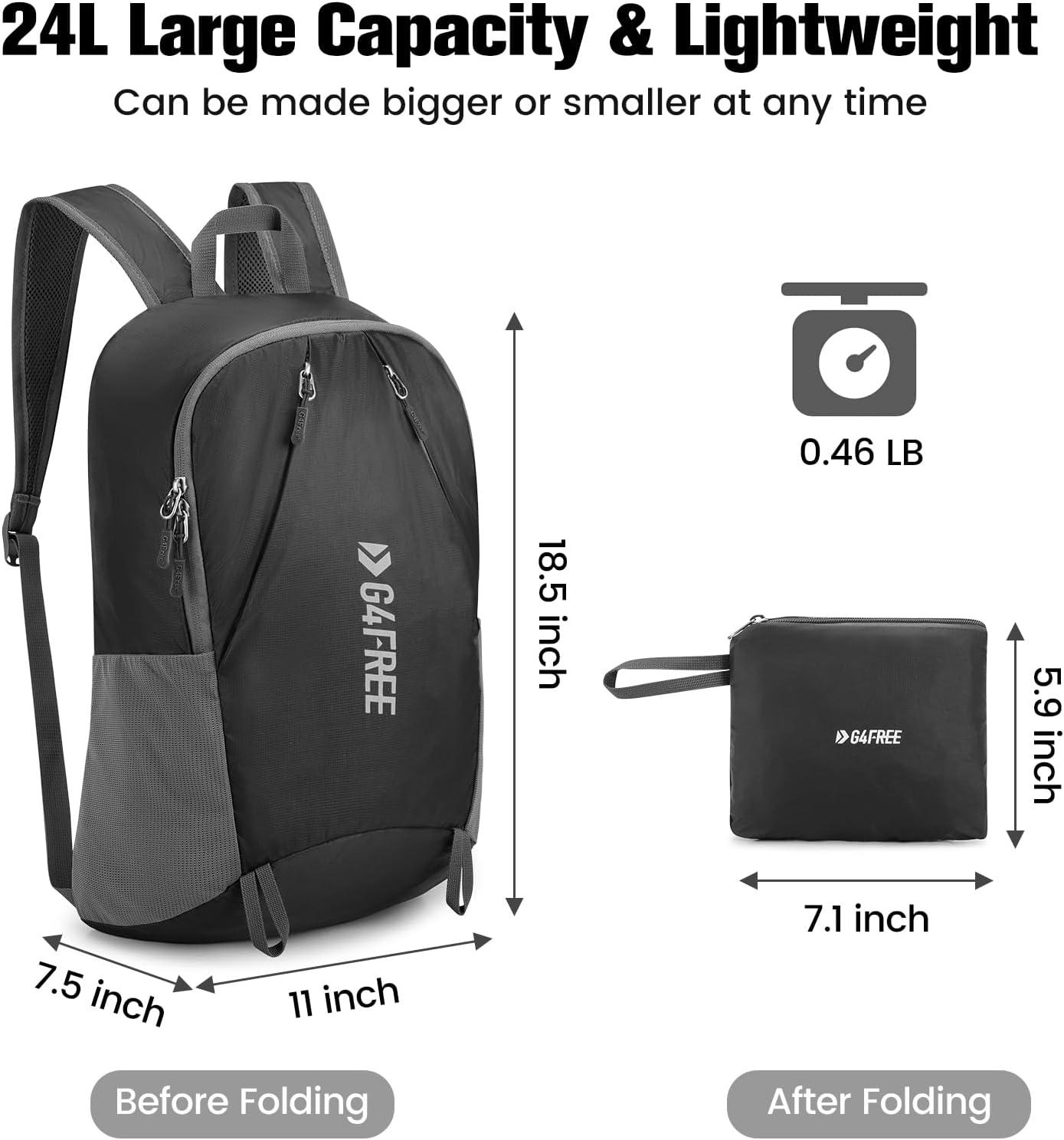 PACKABLE AND 24 L LARGE CAPACITY: This packable backpack is easy to fold up into its inner pocket. The folded size is only 7.1*5.9*2 inches. the expansion size is 11*7.5*18.5 inches, and the entire bag reaches 24 L