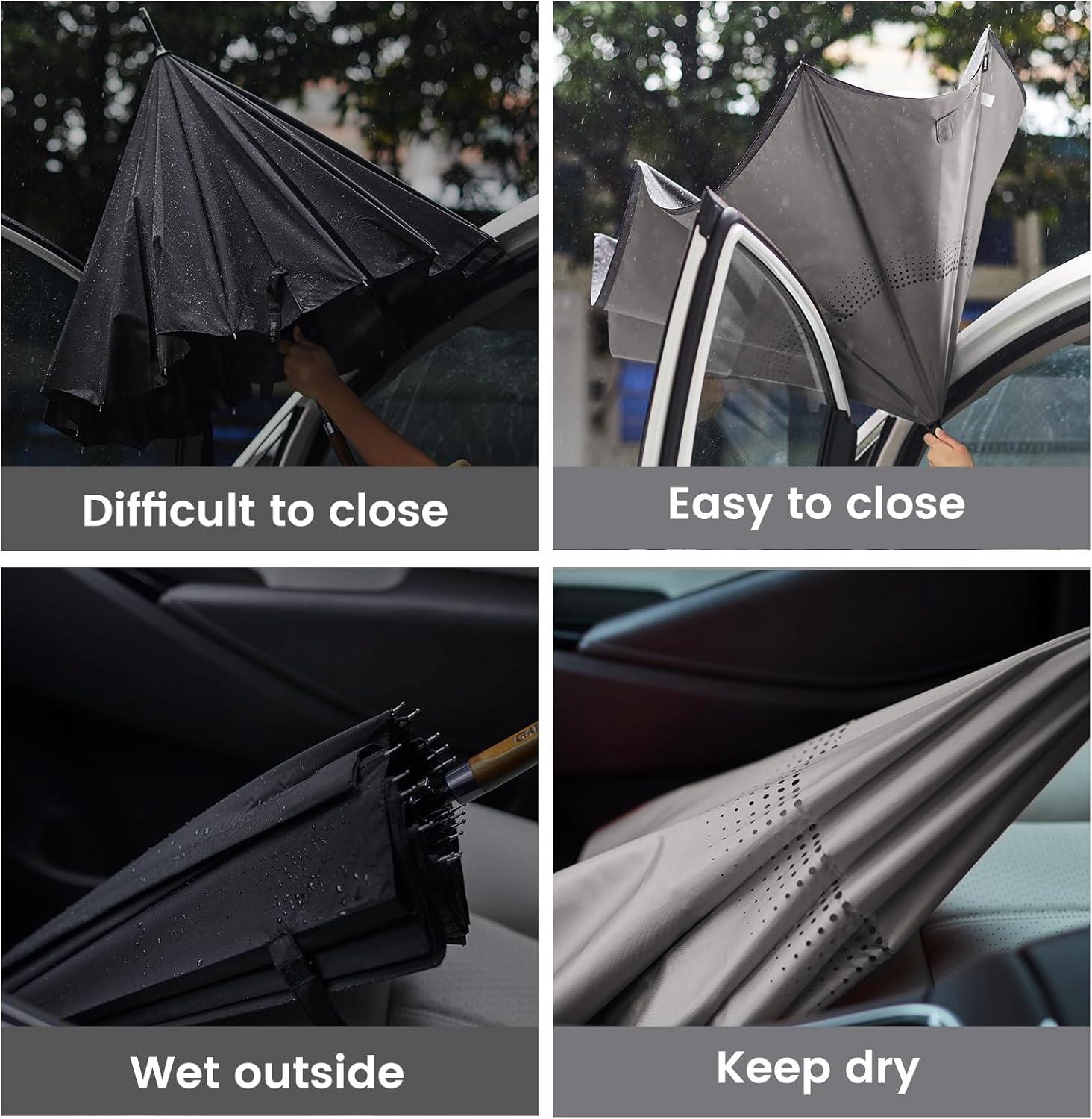 Reverse Folding Design: This upside-down umbrella closes inside out. When you close it, the wet layer will be inside the umbrella, preventing water from dripping and keeping you completely dry. You don't need to worry about the umbrella wetting your floor and mat. It stands upright by itself when not in use. Just say goodbye to the umbrella stand.