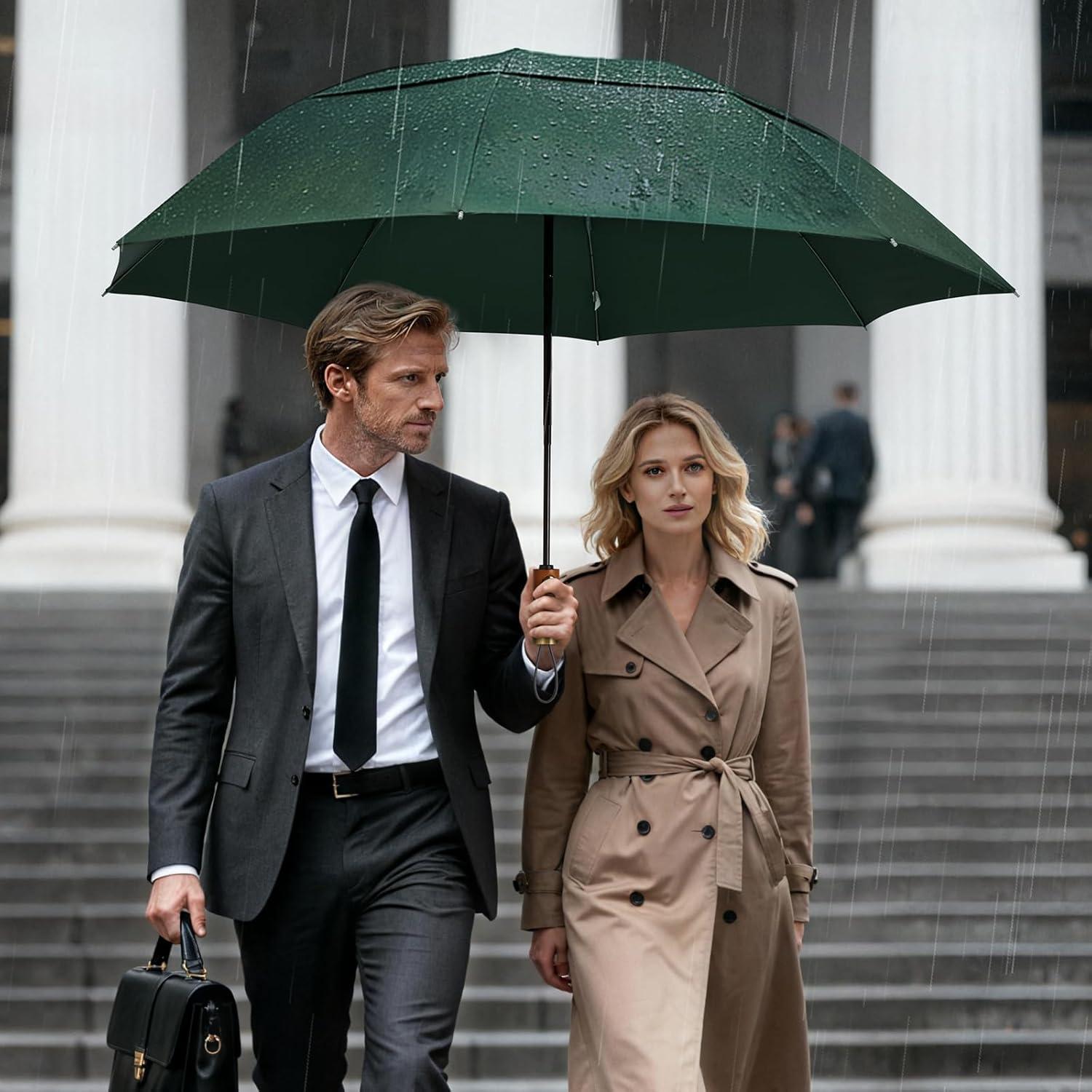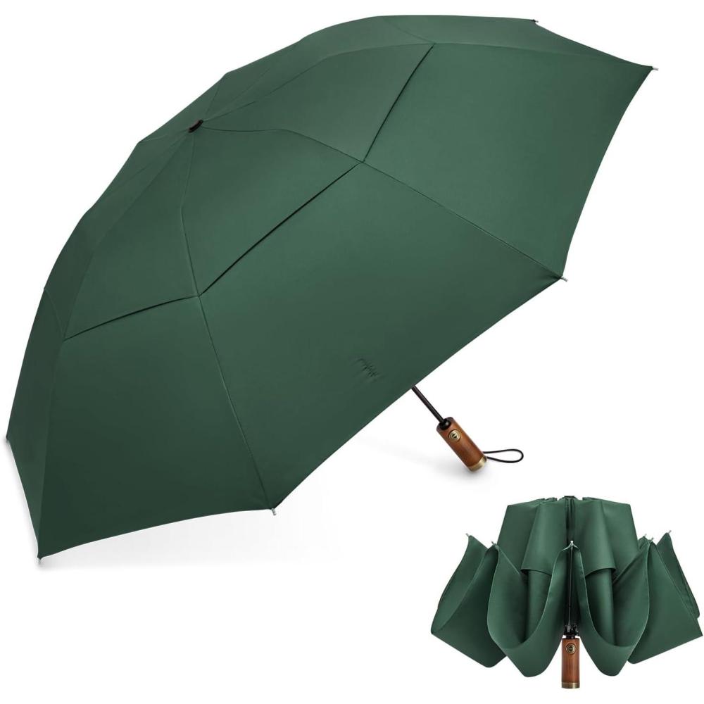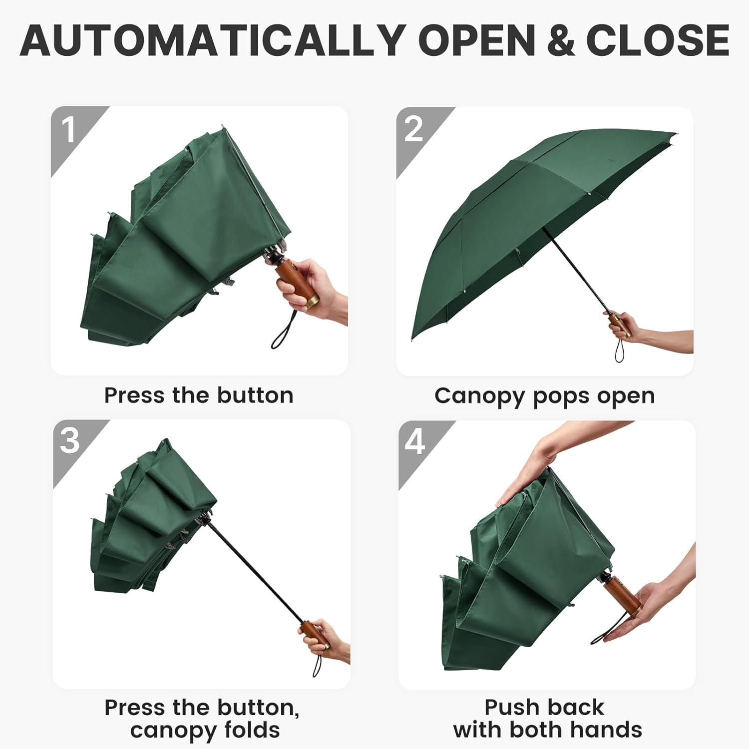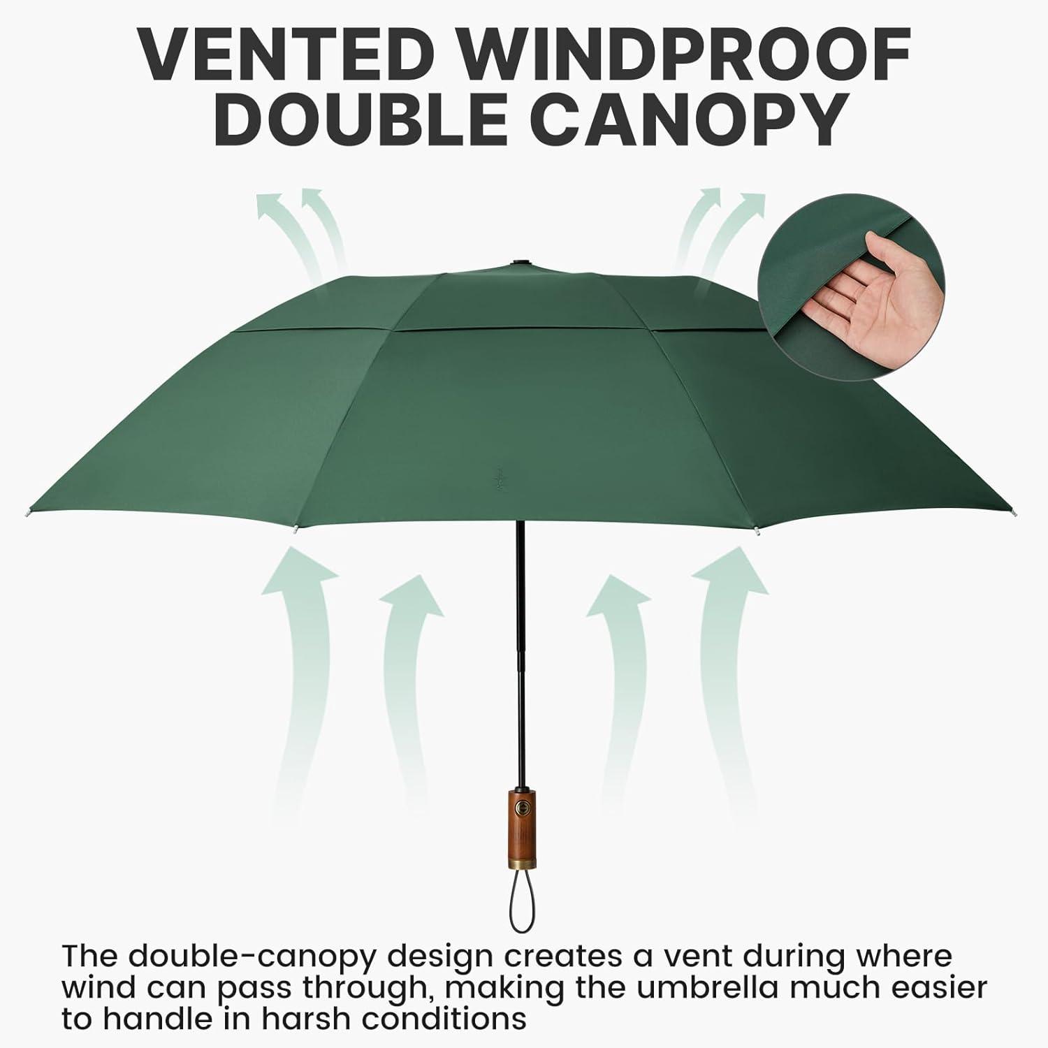 G4Free 54 Inch Inverted Windproof Umbrella with Wooden Handle, Large Double Canopy Auto Open & Close Golf Umbrella, Portable & Durable Rain Umbrella, Fits Car & Backpack(Dark Green)