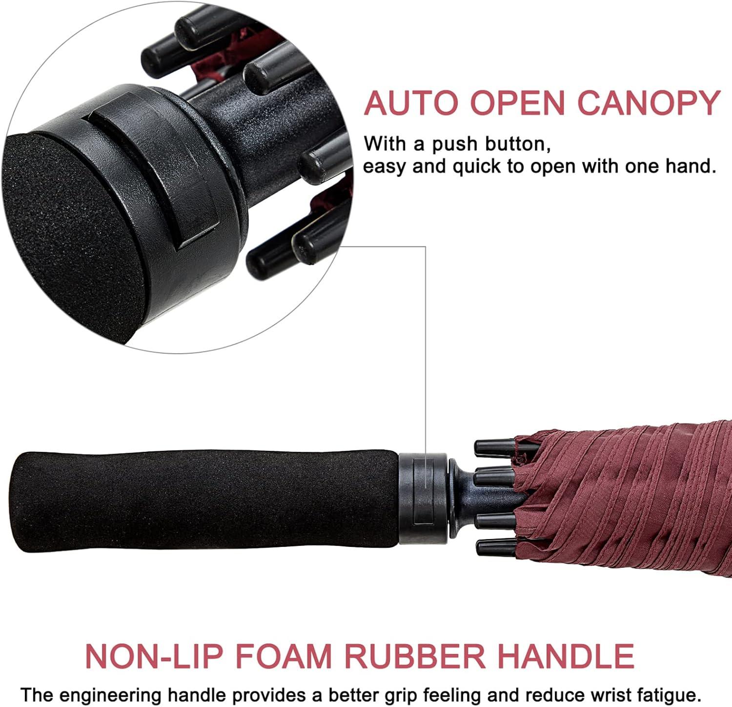 [Auto open in one second] OPENS FAST Automatic Open functionality ensures that there will be no delay to your comfort. Simply press the button on the handle to open. Double tie-down straps that wrap the large umbrella closed tightly. Carry a sleeve with straps, convenient to store.