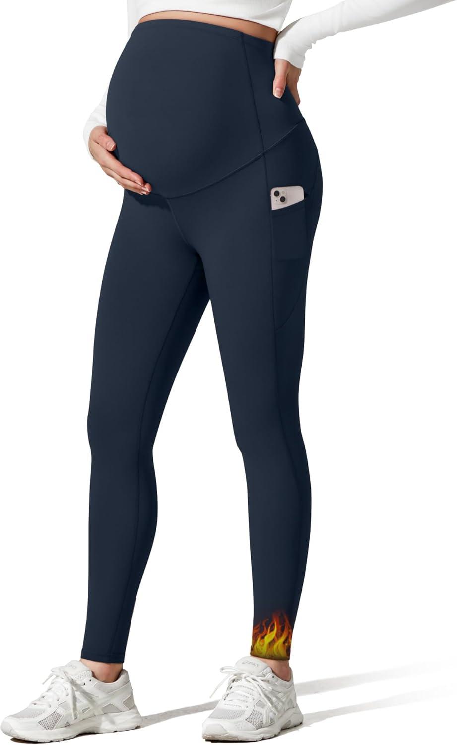 G4Free Barefeel Fleece Lined Maternity Leggings with Pockets Over The Belly Pregnancy Yoga Pants(Dark Navy)