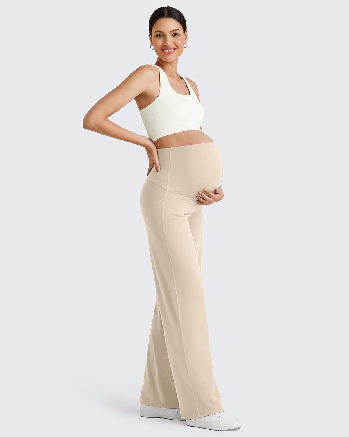 G4Free BareFeel Maternity Dress Yoga Pants Over The Belly Stretchy Work Slack Pregnancy Wide Leg Lounge Trousers(Light Khaki)