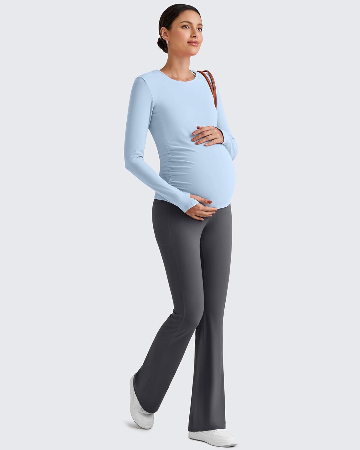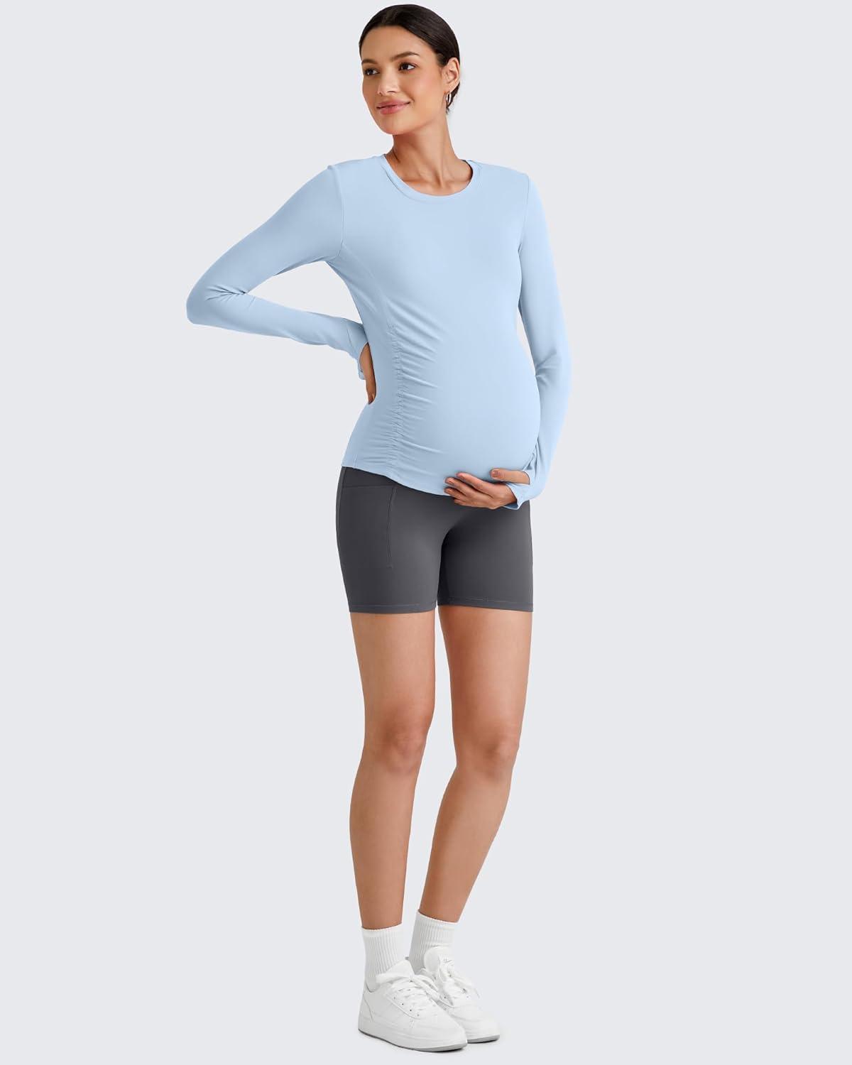 G4Free BareFeel Maternity Long Sleeve T Shirts Crewneck Ruches Pregnancy Workout Tops with Thumbholes Altheltic Yoga Tee(Light Denim)