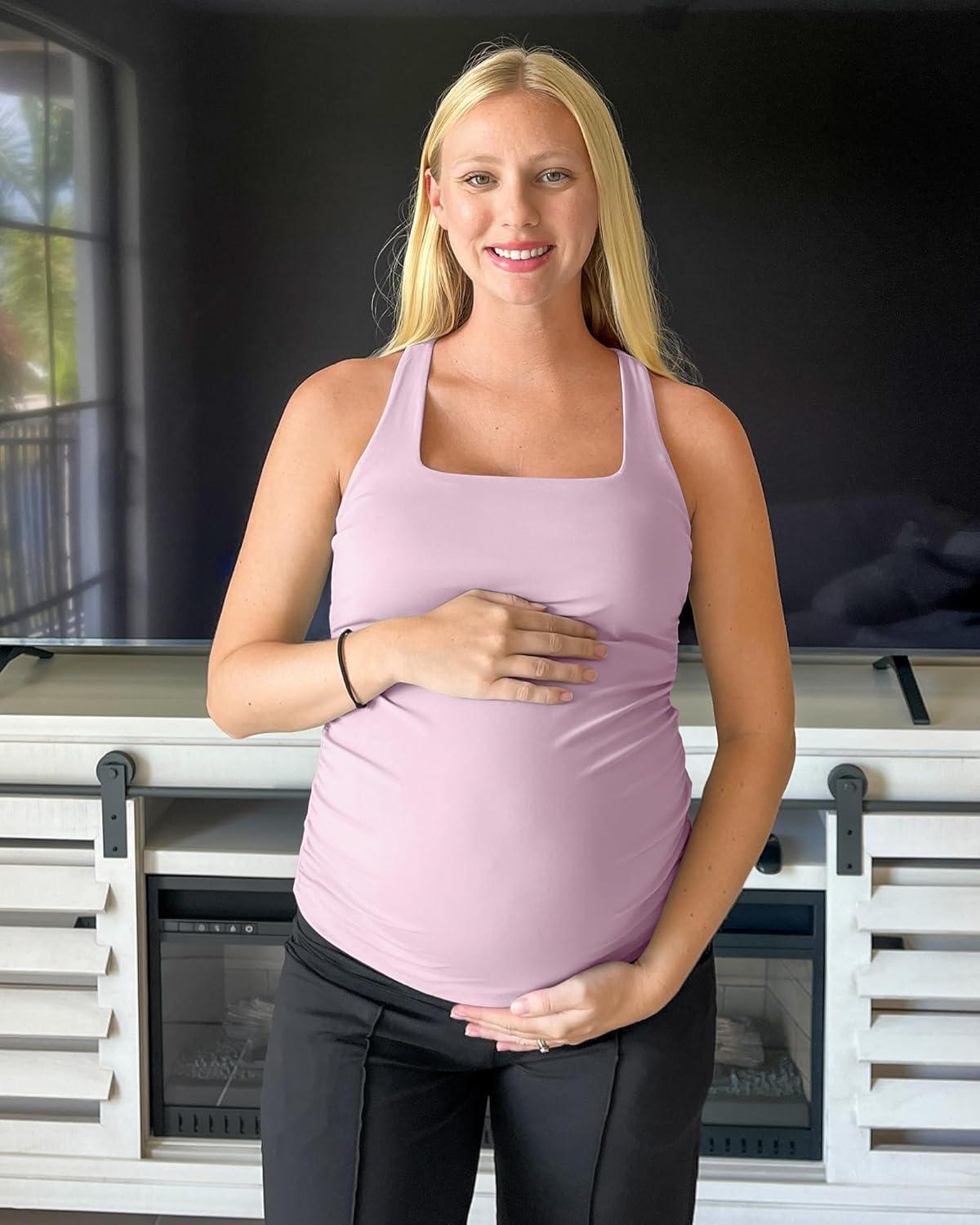 G4Free BareFeel Maternity Racerback Tank Tops with Built in Bra Ruched Sleeveless Square Neck Pregnancy Yoga Workout Shirts(Pink)