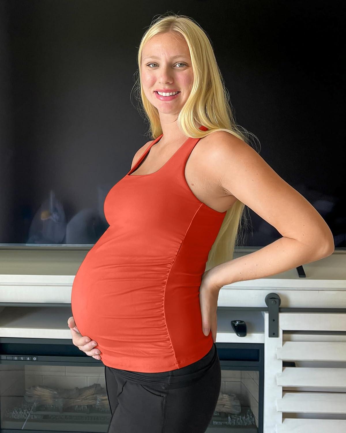 G4Free BareFeel Maternity Racerback Tank Tops with Built in Bra Ruched Sleeveless Square Neck Pregnancy Yoga Workout Shirts(Rust Orange)