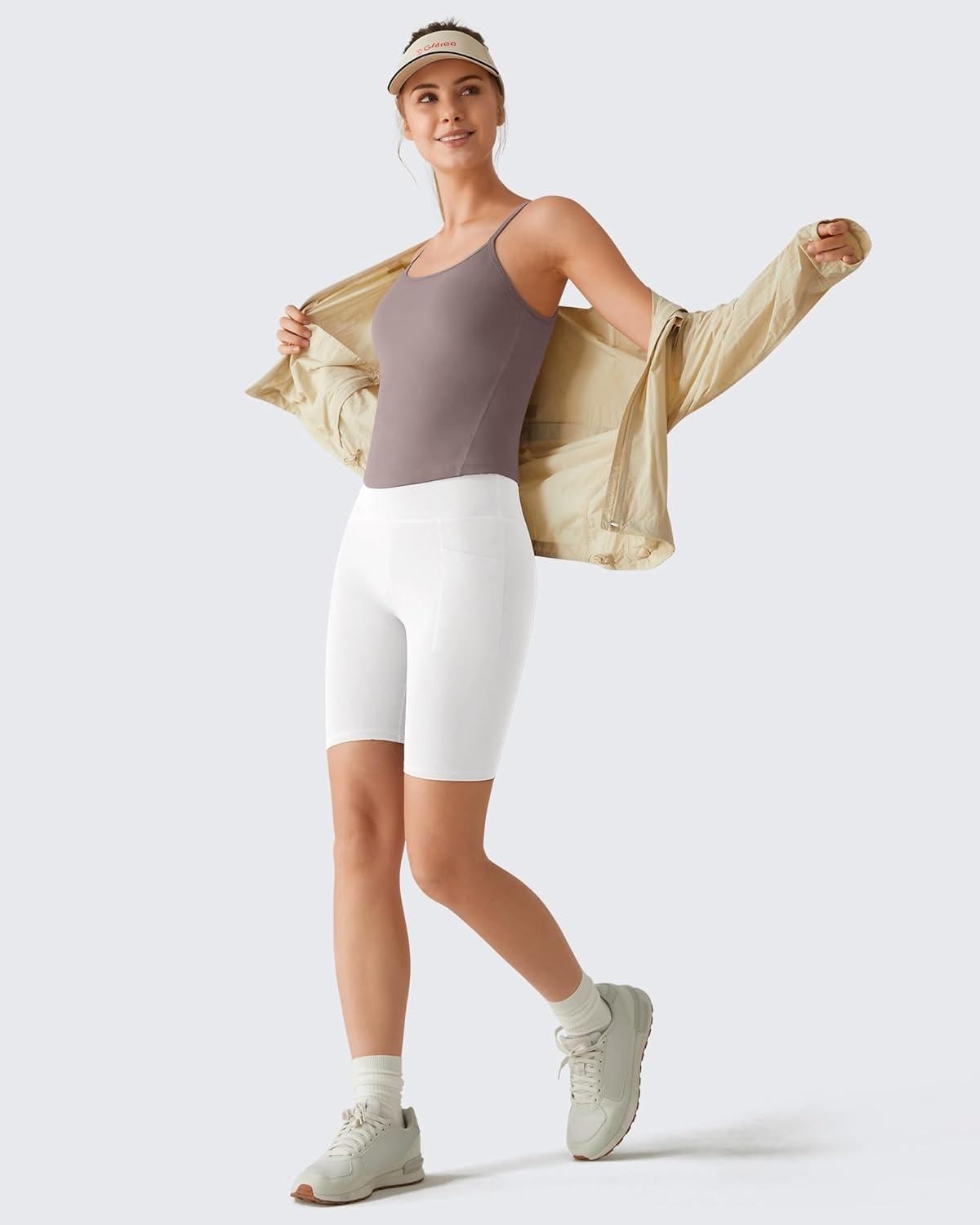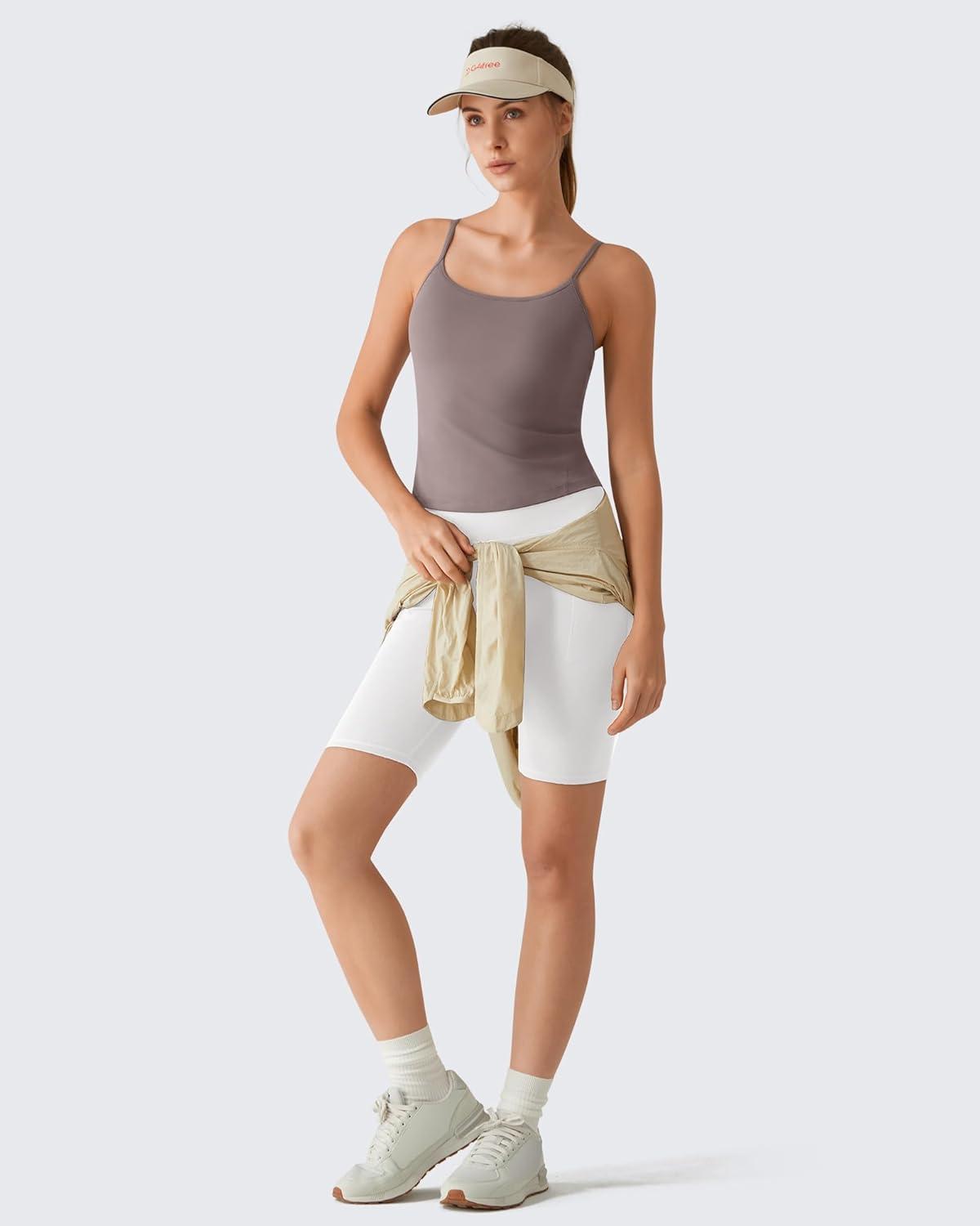 G4Free BareFeel Women's Built in Bra Camisole Tank Tops Removable Padded Spaghetti Strap Square Neck Casual Yoga Pilates Top(Taupe)