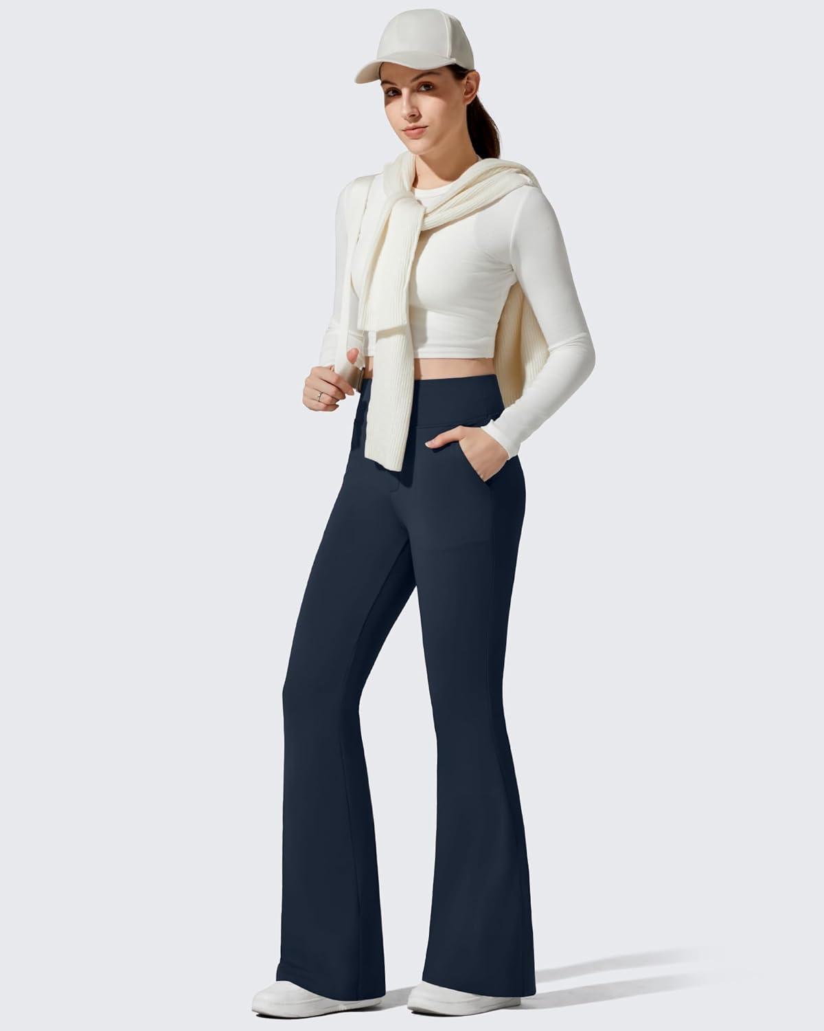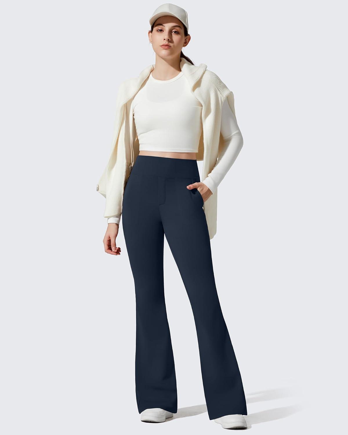 G4Free Barefeel Women's Fleece Lined Flare Yoga Pants Winter Thermal High Waist Leggings with Pockets(Dark Navy)