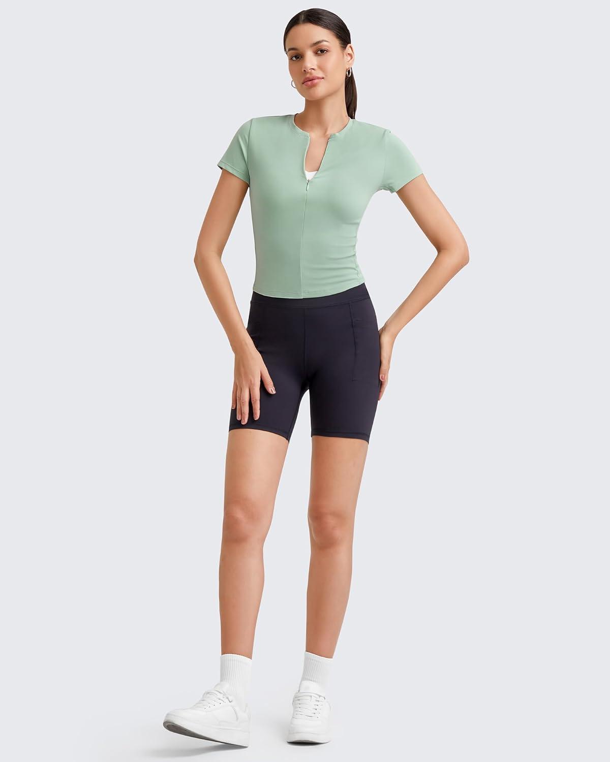 G4Free BareFeel Womens Workout Tops Short Sleeve Half Zip Slim Fit Athletic Shirts Gym Running Yoga Slight Crop Tshirts(Bean Green)