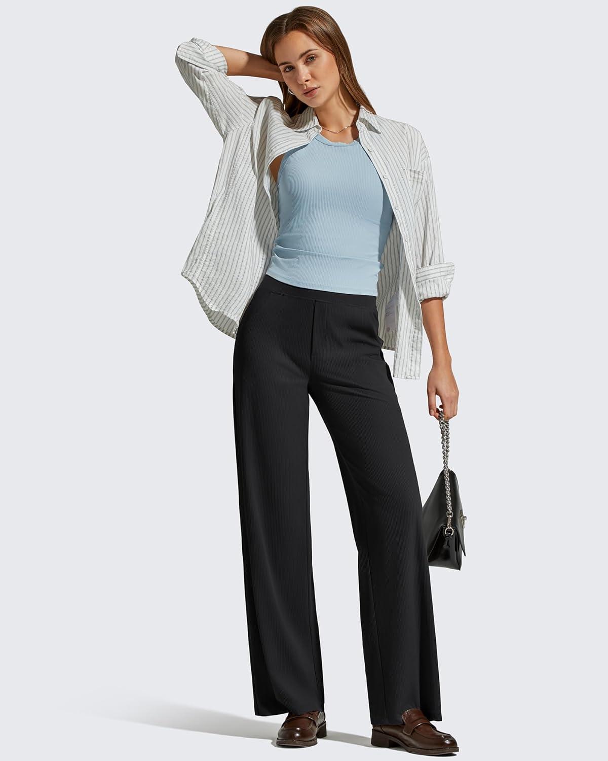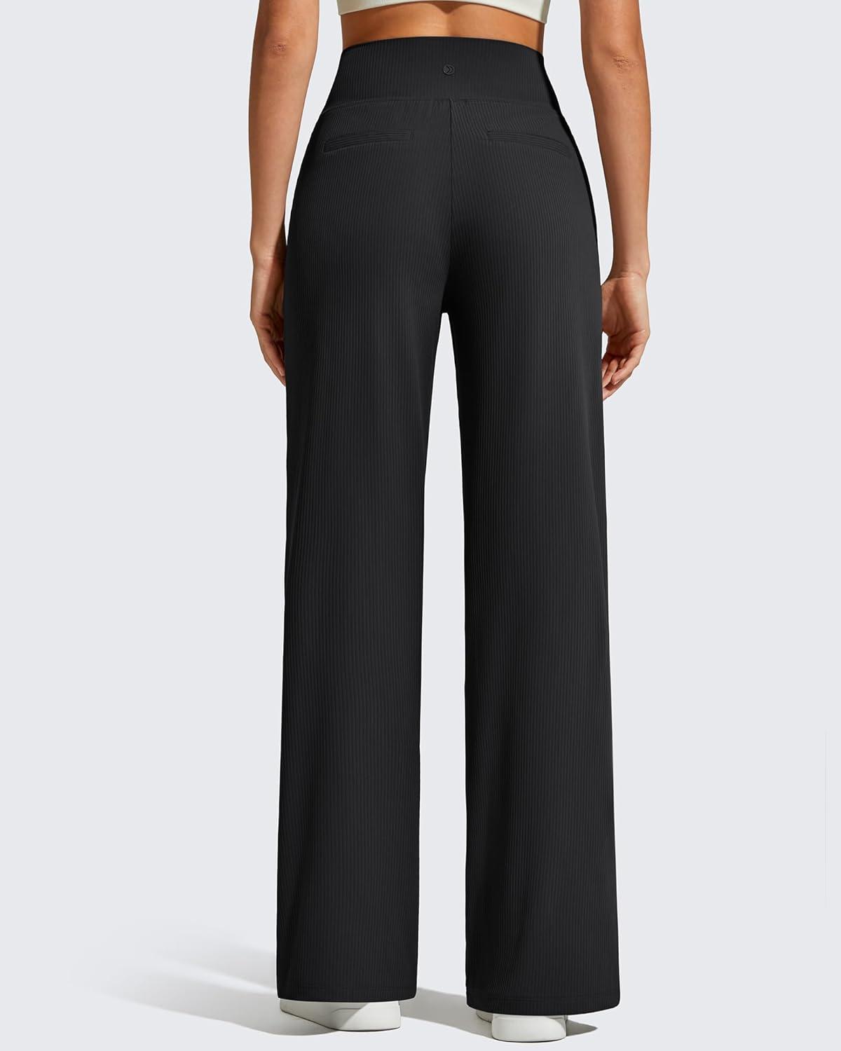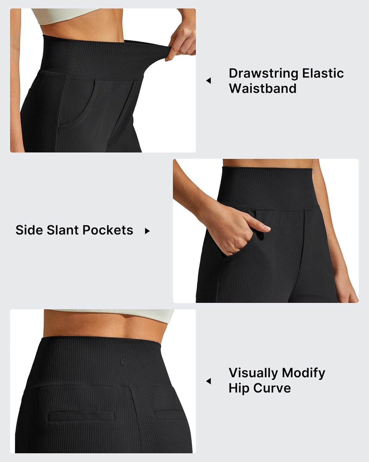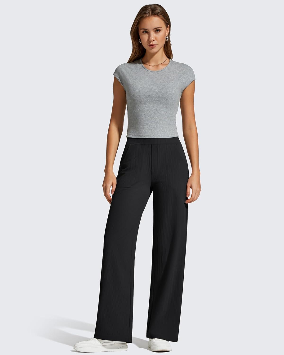 G4Free Breathable Ribbed Knit Wide Leg Yoga Pants Women Stretch Yoga Pants High Waist Trouser with Pockets(Black)