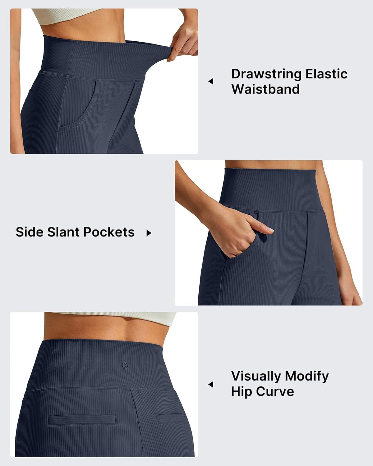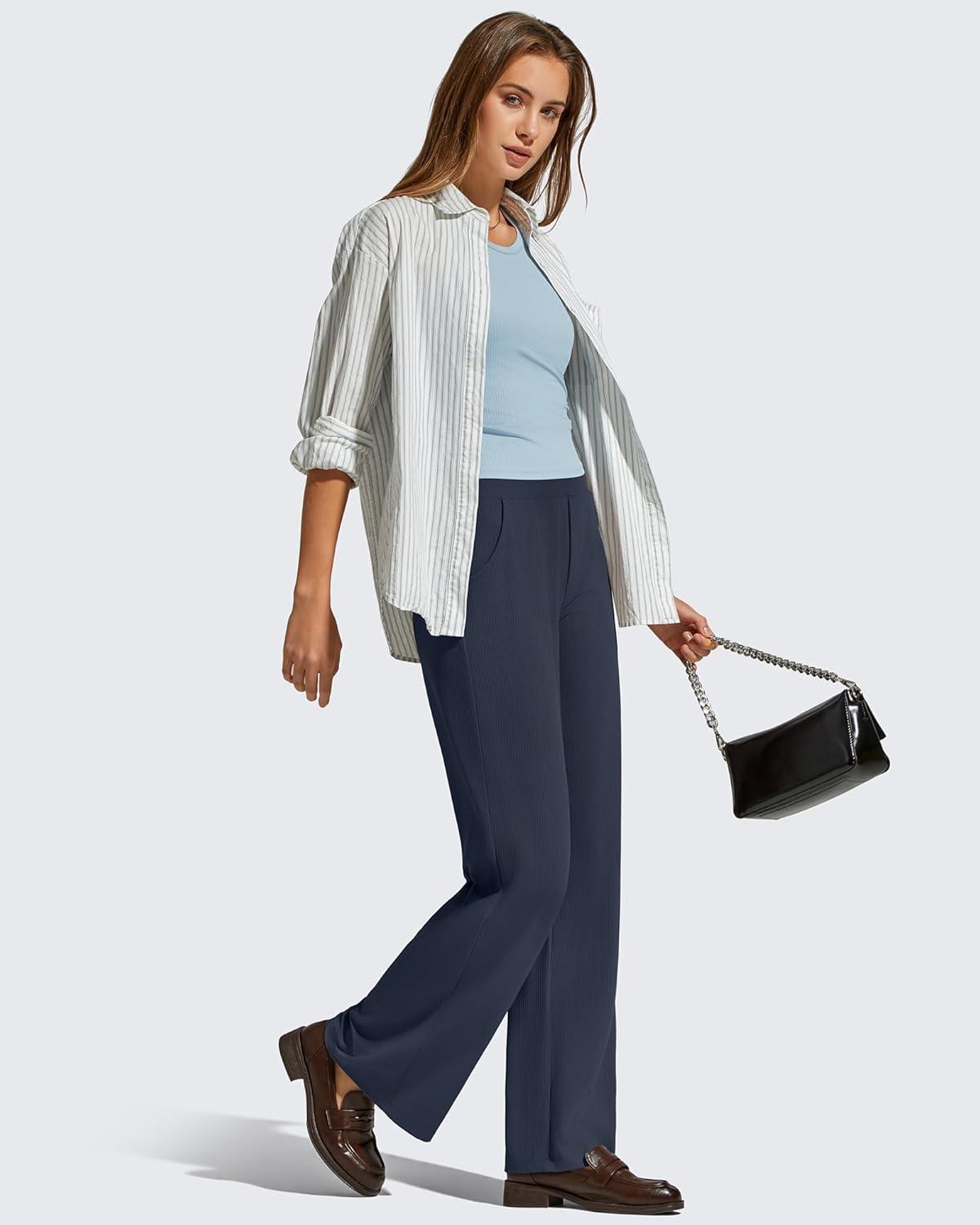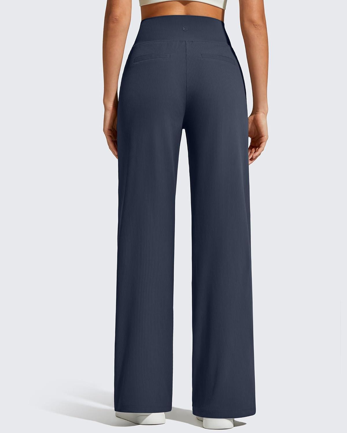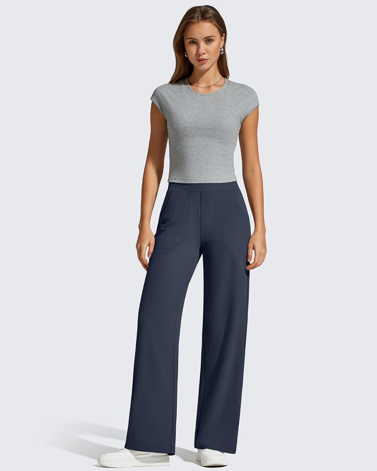 G4Free Breathable Ribbed Knit Wide Leg Yoga Pants Women Stretch Yoga Pants High Waist Trouser with Pockets(Dark Blue)