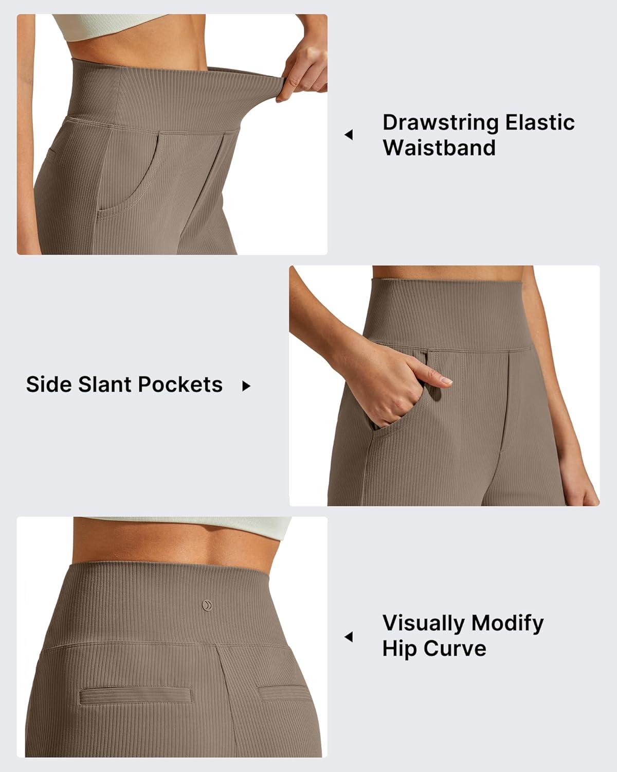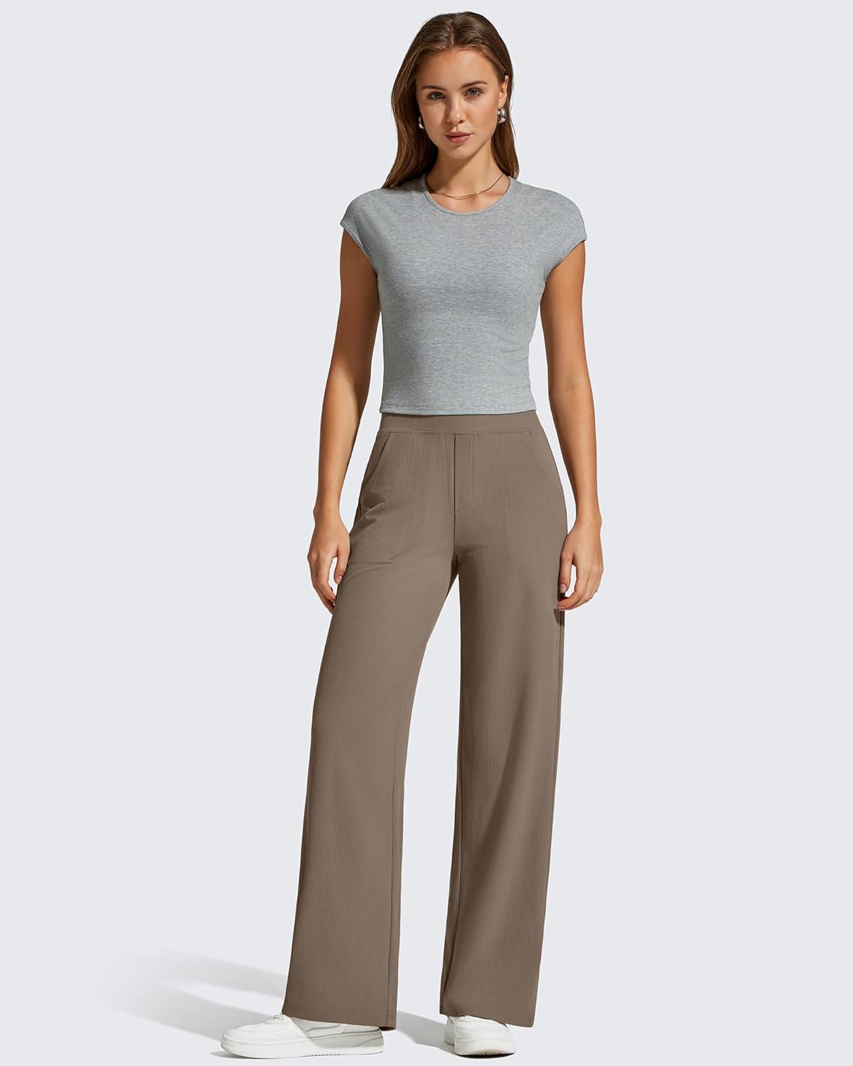 G4Free Breathable Ribbed Knit Wide Leg Yoga Pants Women Stretch Yoga Pants High Waist Trouser with Pockets(Dirty Latte)