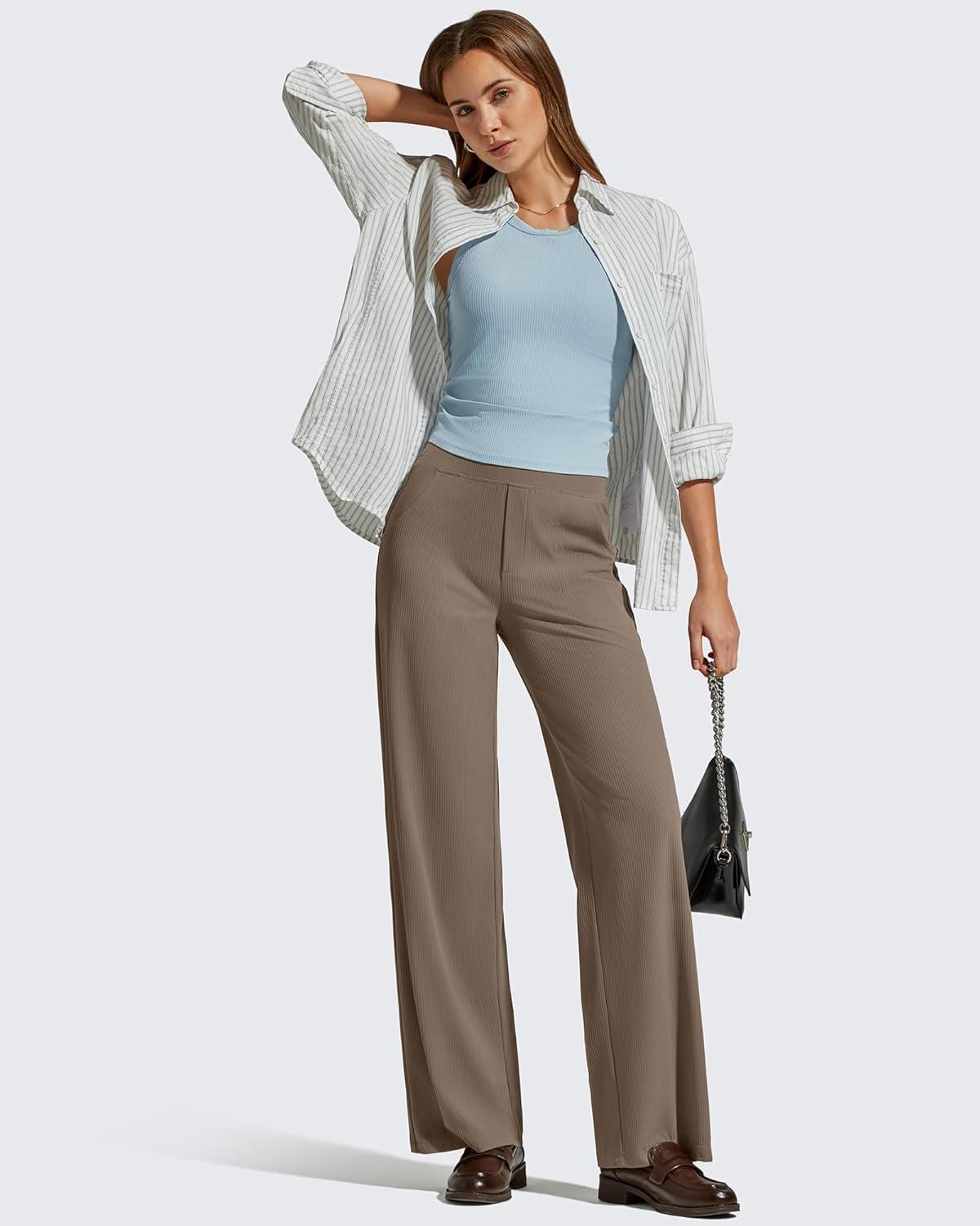 G4Free Breathable Ribbed Knit Wide Leg Yoga Pants Women Stretch Yoga Pants High Waist Trouser with Pockets(Dark Brown)