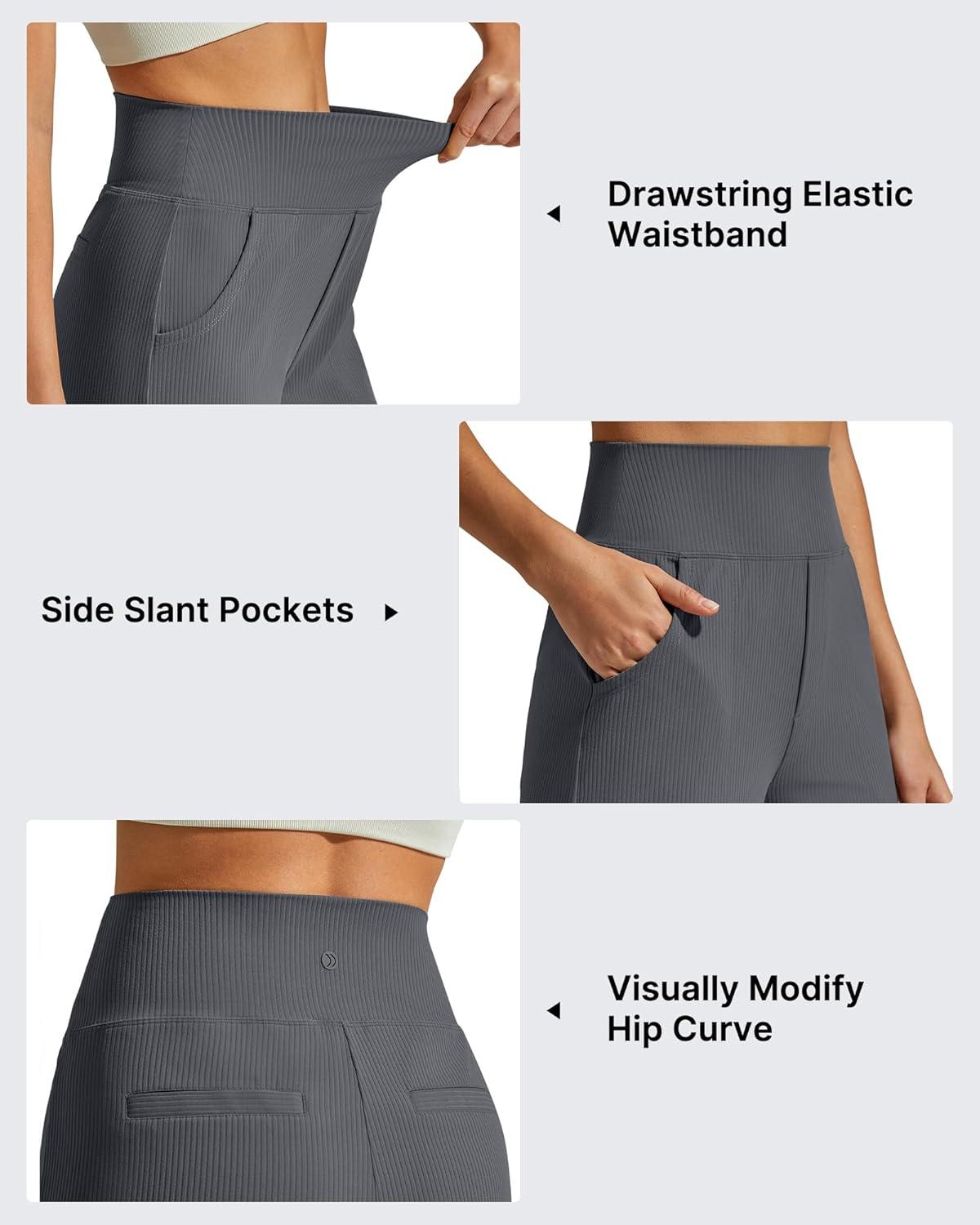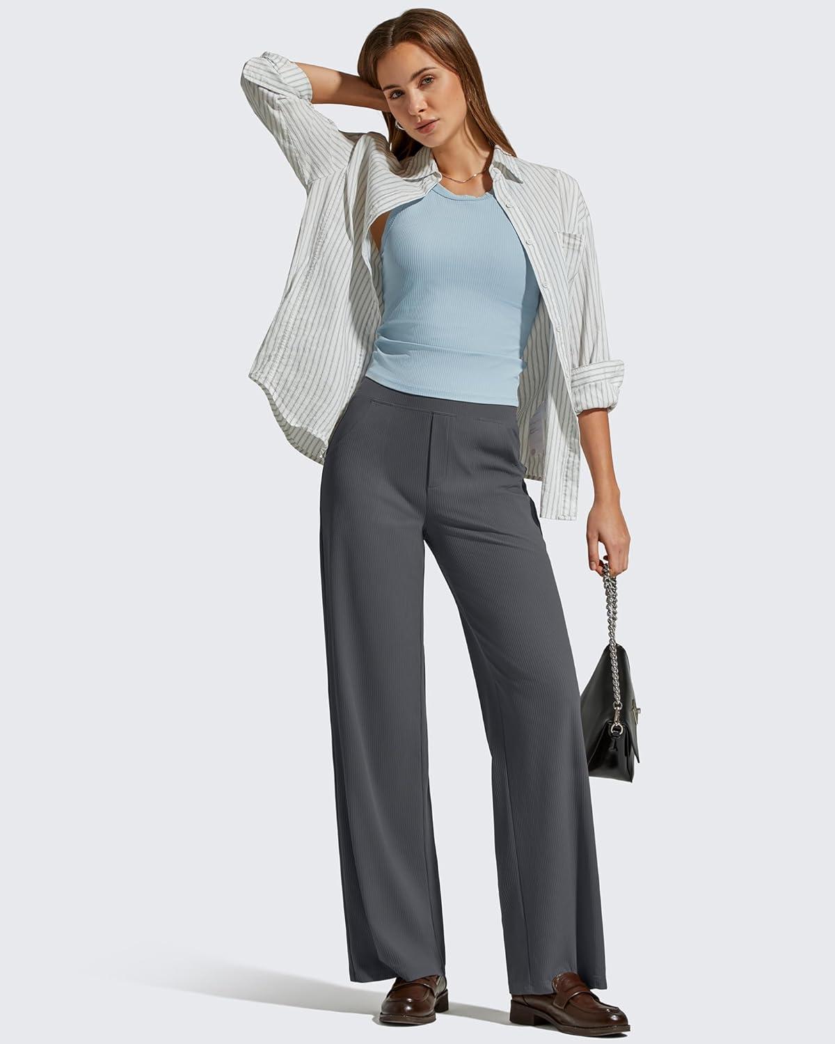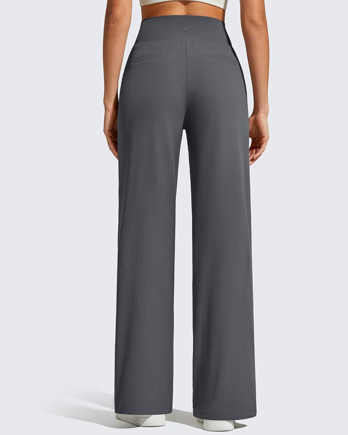G4Free Breathable Ribbed Knit Wide Leg Yoga Pants Women Stretch Yoga Pants High Waist Trouser with Pockets(Dark Gray)