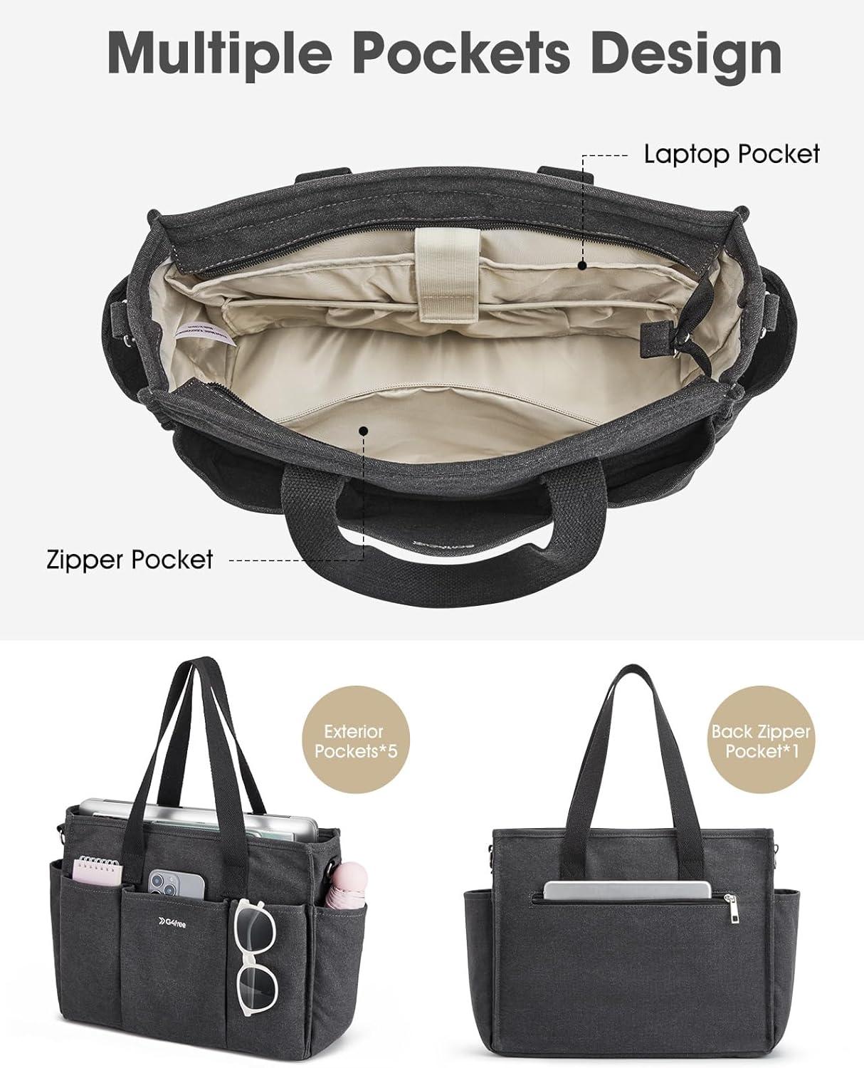 imageG4Free Canvas Tote Bag with Pockets Medium Size Crossbody Work Tote Bag for Women Zipper ClosureBlack