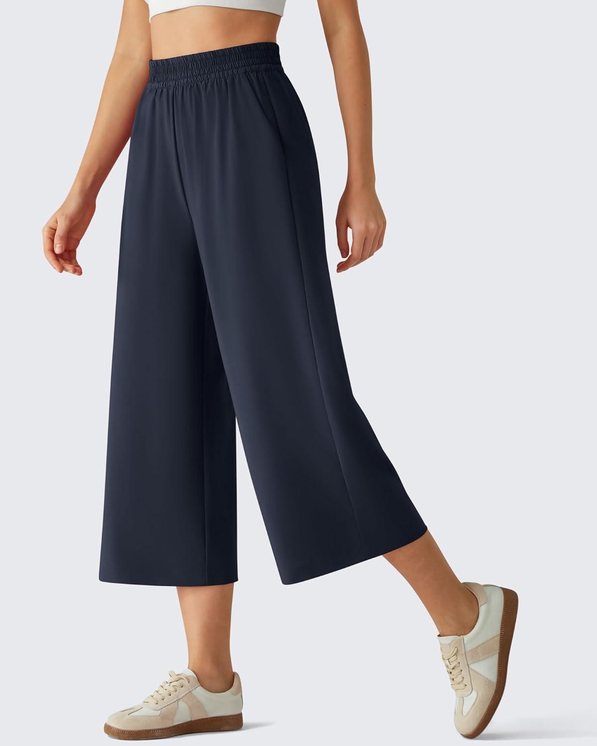 G4Free Chillwhisp Flowy Capri Pants for Women Lightweight Wide Leg Palazzo Cropped Pants Elastic Waist Yoga Capris(Dark Navy)