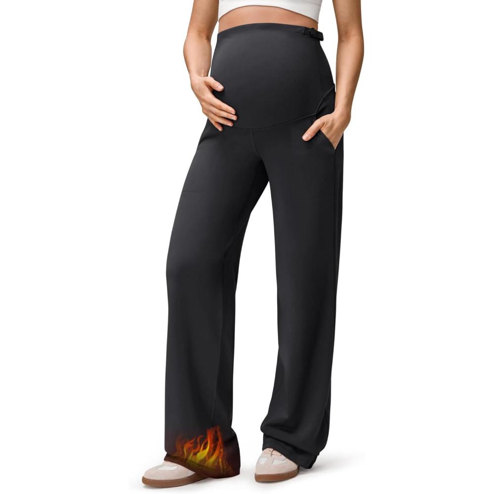 G4Free EverGoing Fleece Lined Maternity Wide Leg Pants Over The Belly Pregnancy Trousers with Pockets(Black)