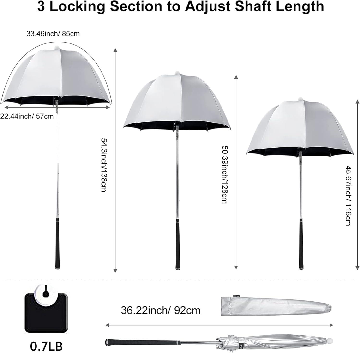 Telescopic Umbrella Shaft. Multiple locking sections in the shaft to adjust the shaft to 3 different lengths. The extended max length is 54.3 inches and retracts to 45.6 inches. Folded to 36.2 inches for easy storage in golf bag side pockets. Come with an umbrella cover to protect the umbrella canopy.
