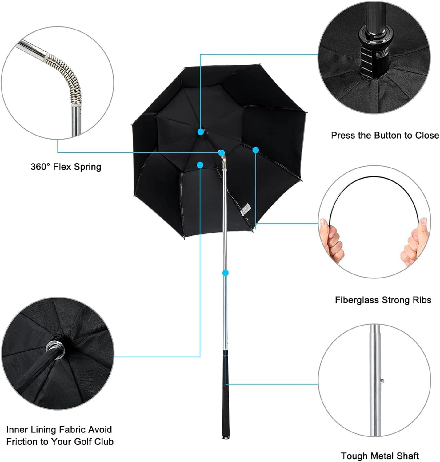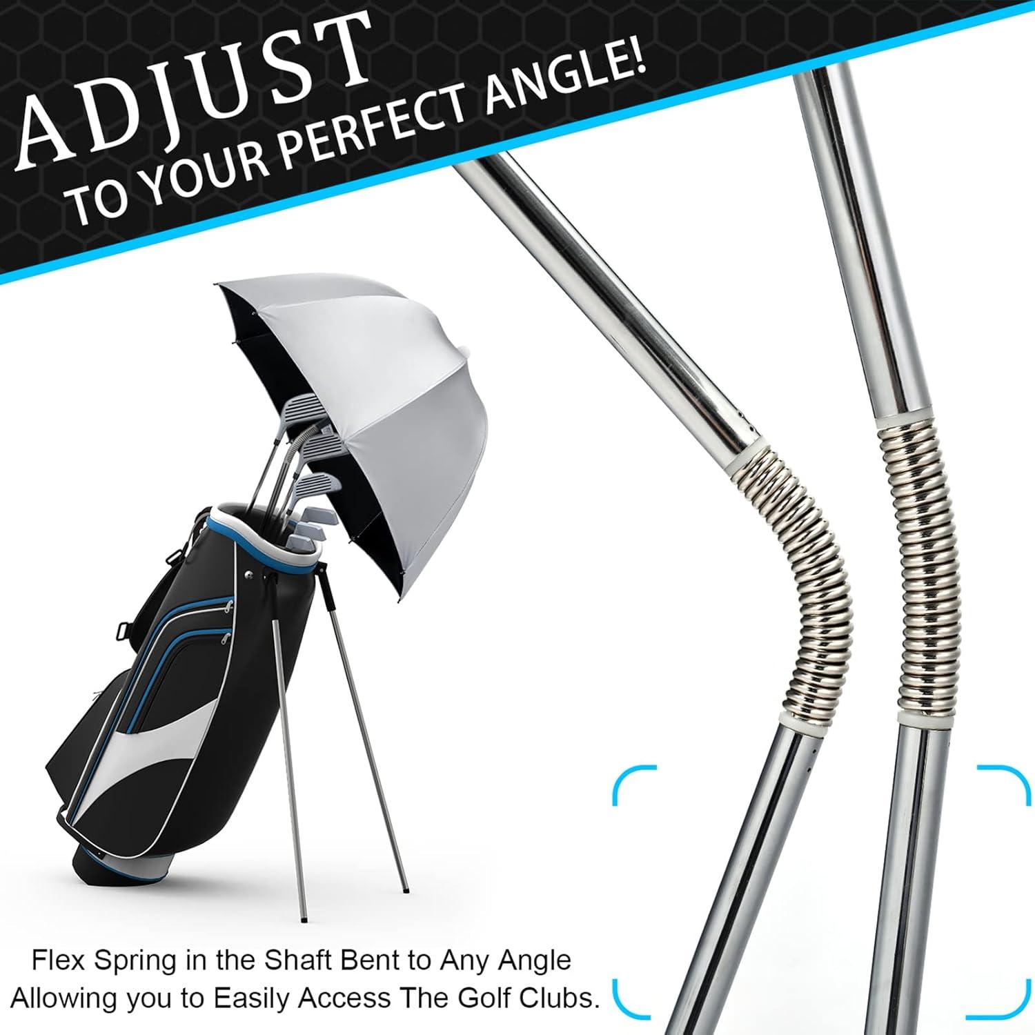 360° Direction Canopy. A convenient flex spring top in the shaft allows the canopy to pivot at any angle to easily access your golf club and quickly pull back for protection.