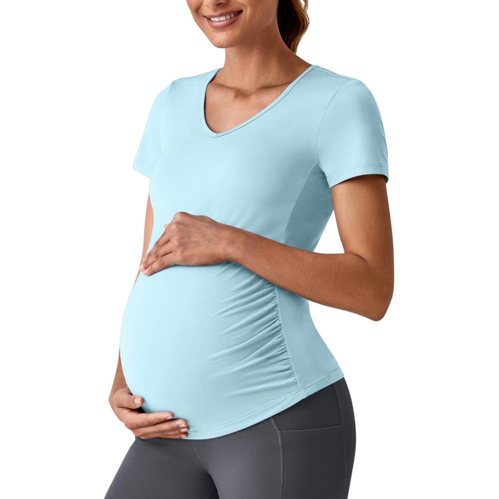 G4Free Lightweight Maternity Shirts Short Sleeve V Neck Pregnancy Workout Tops Side Ruched Stretchy Yoga Lounge Tees(Light Blue)