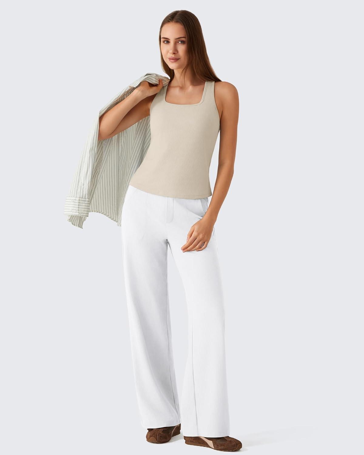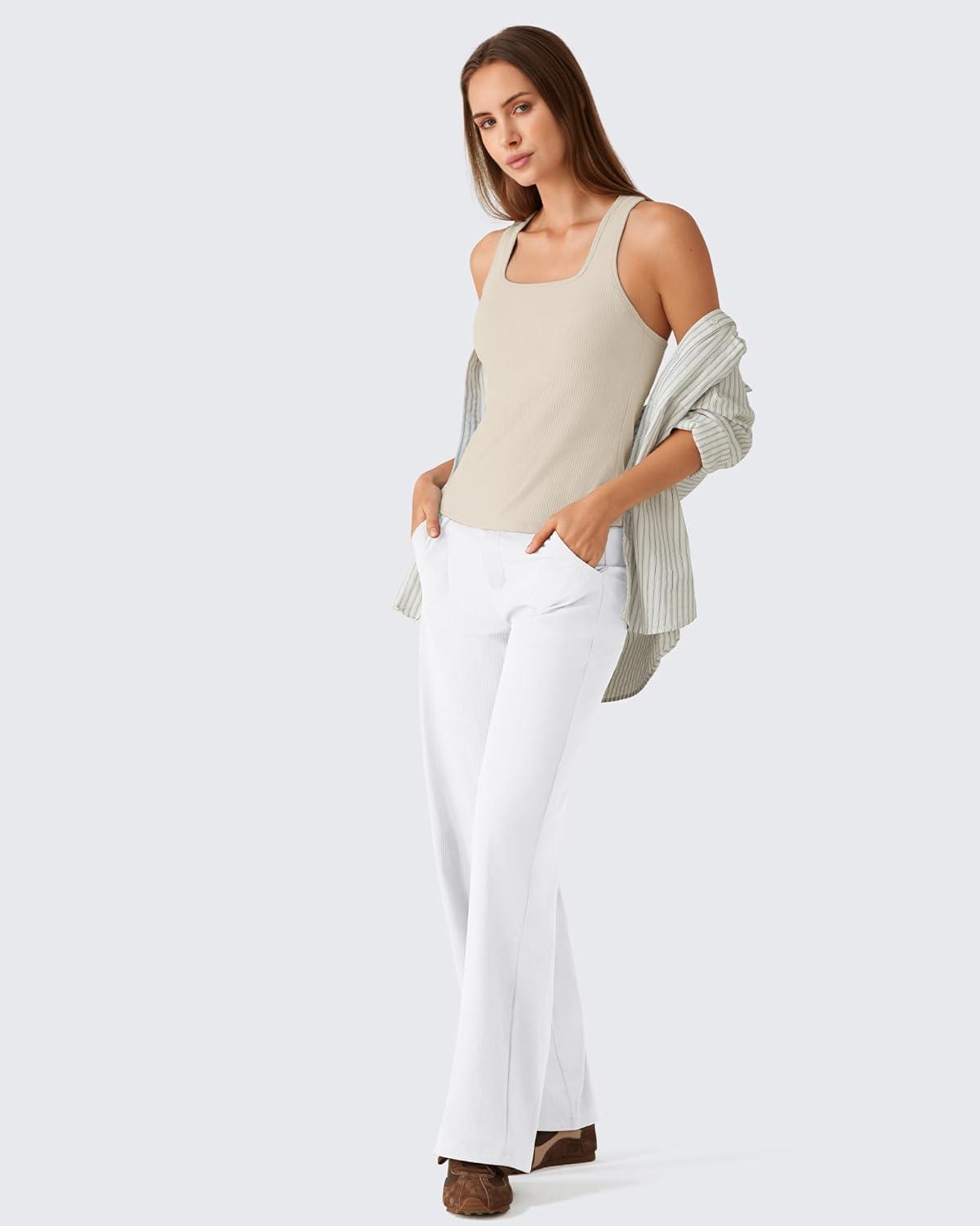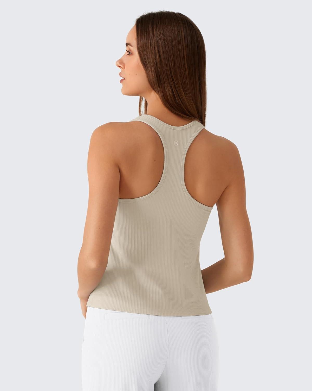 G4Free Ribbed Removable Built in Bra Workout Tank Tops Woman Racerback Square Neck Yoga Top Lightweight Athletic Tanks(Light Khaki)