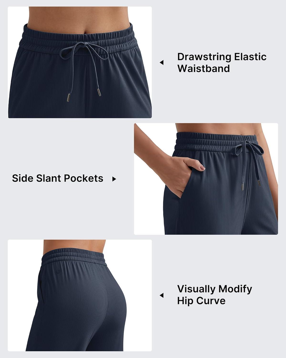 G4Free Ribbed Wide Leg Yoga Pants for Women with Pockets Drawstring High Waist Casual Lounge Pants Petite/Regular/Tall(Dark Navy)
