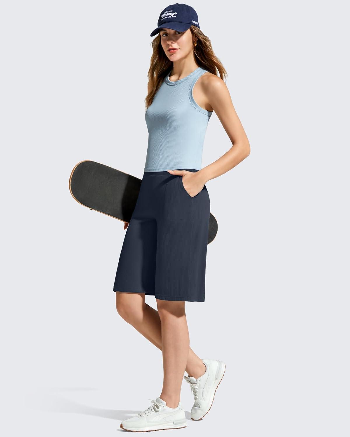 G4Free Ribbed Women’s 11″ Bermuda Shorts with Pockets High Waisted Knee Length Long Shorts Casual Workout(Dark Navy)