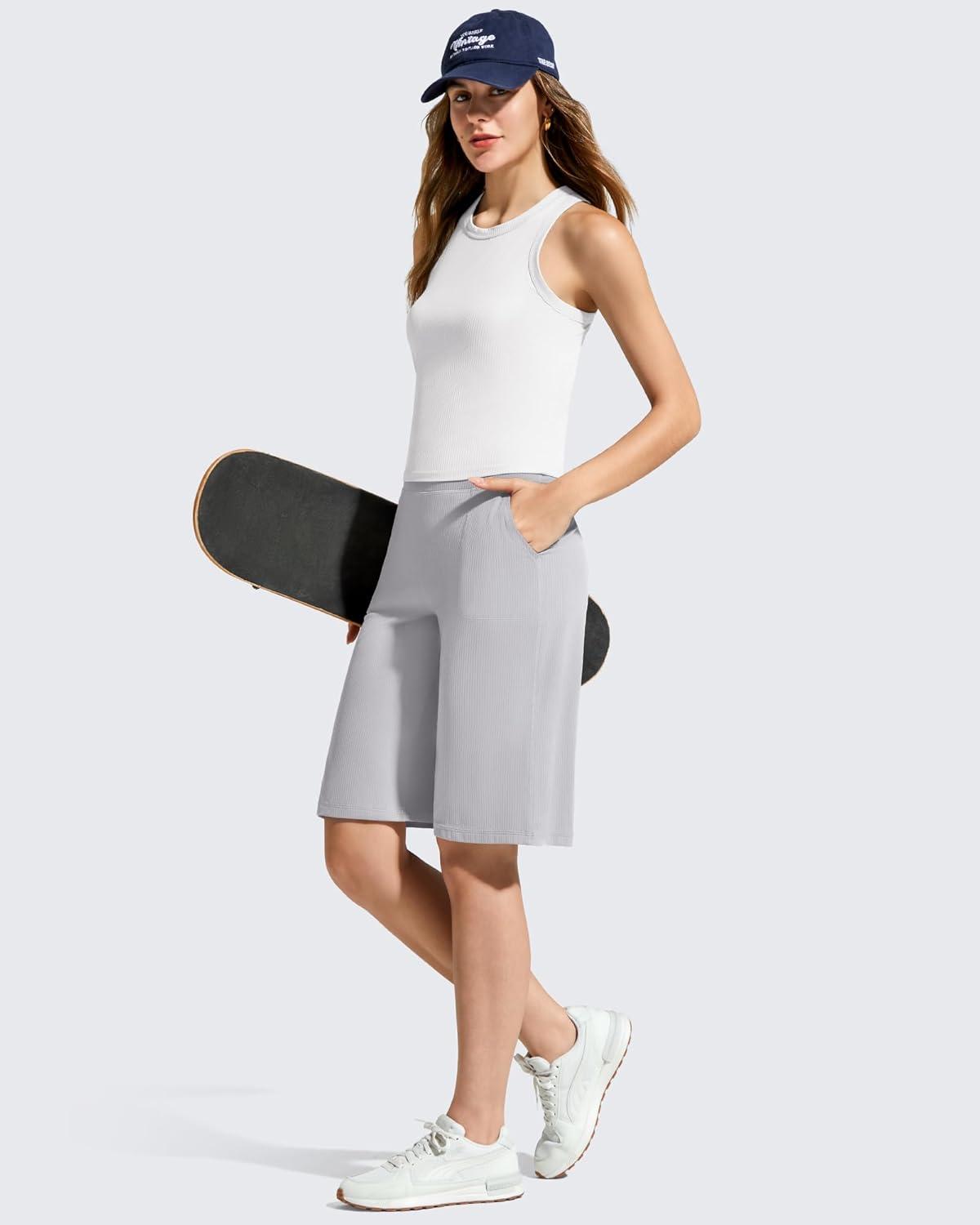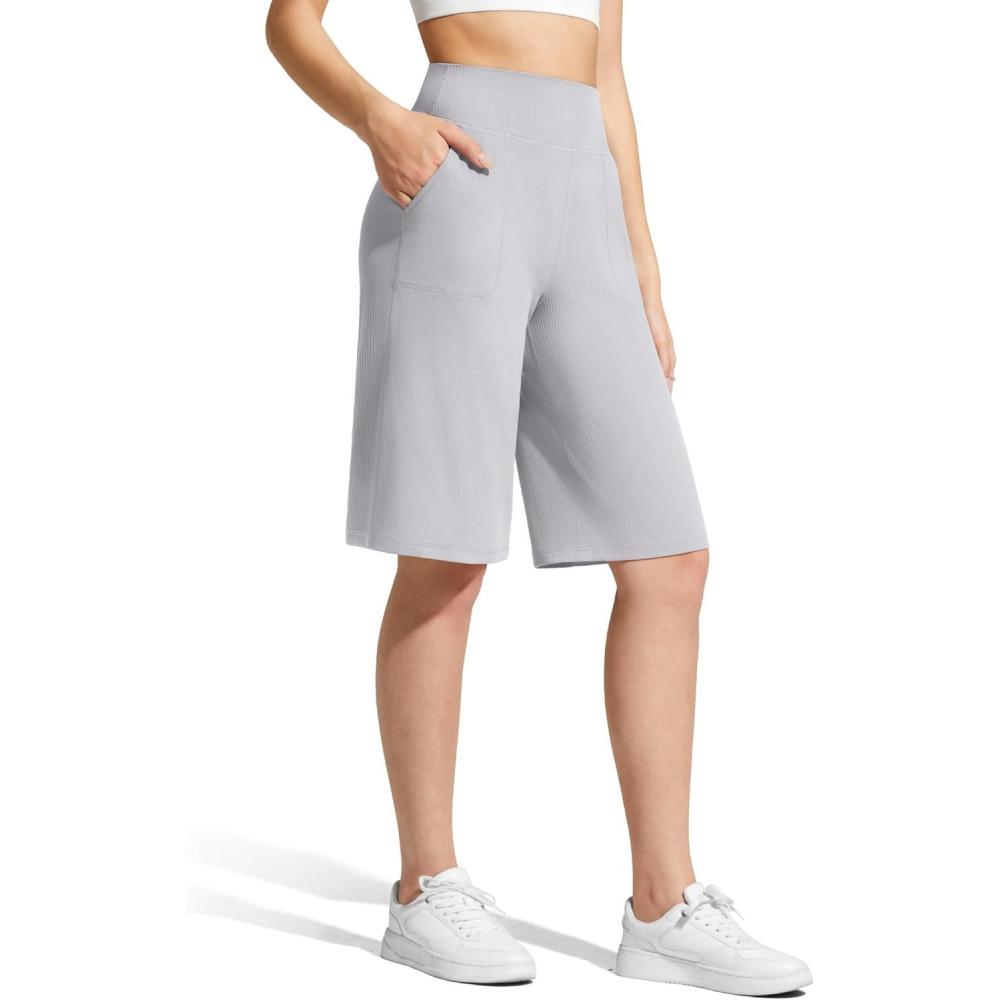 G4Free Ribbed Women’s 11″ Bermuda Shorts with Pockets High Waisted Knee Length Long Shorts Casual Workout(Silver Gray)