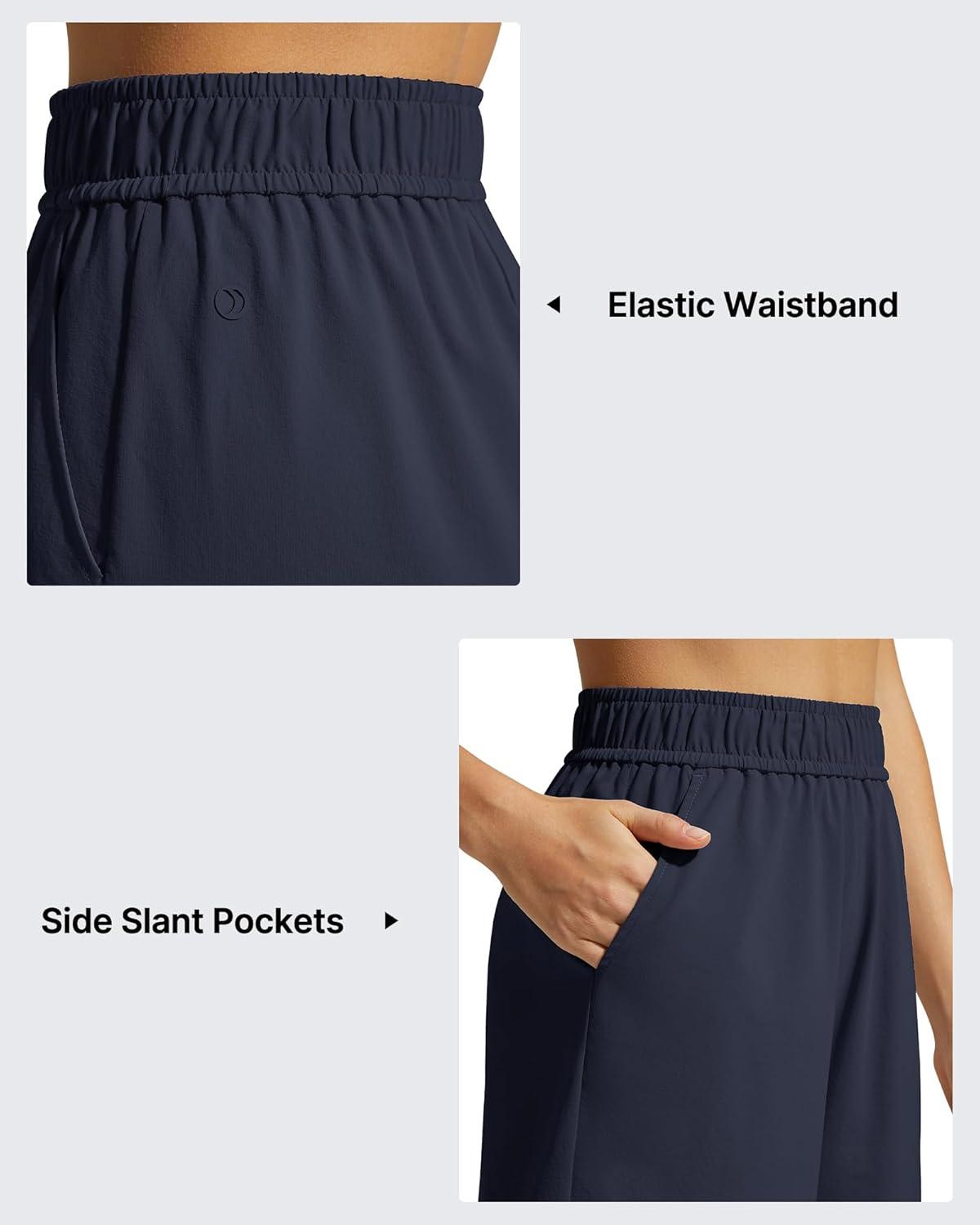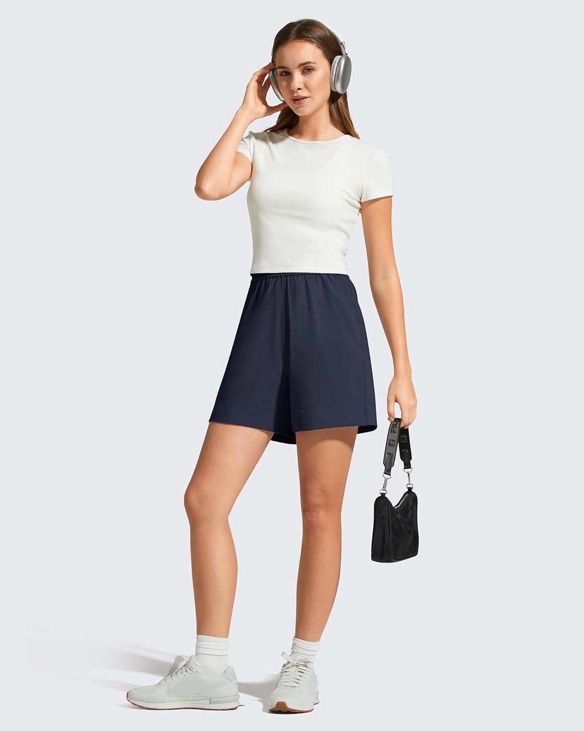 G4Free Strowen Workout Shorts for Women 4'' Elastic Waist Wide Leg A Line Shorts with Pockets Casual Athletic(Dark Navy)
