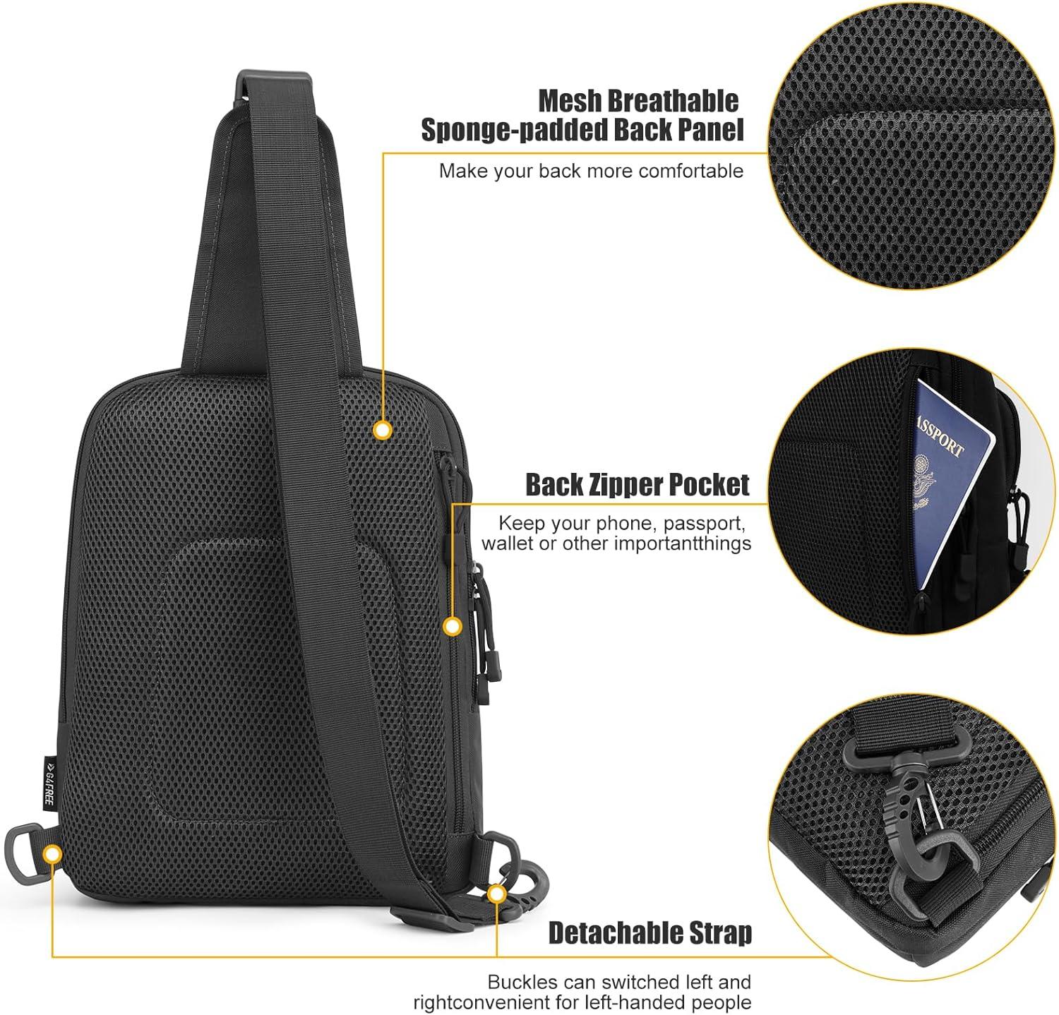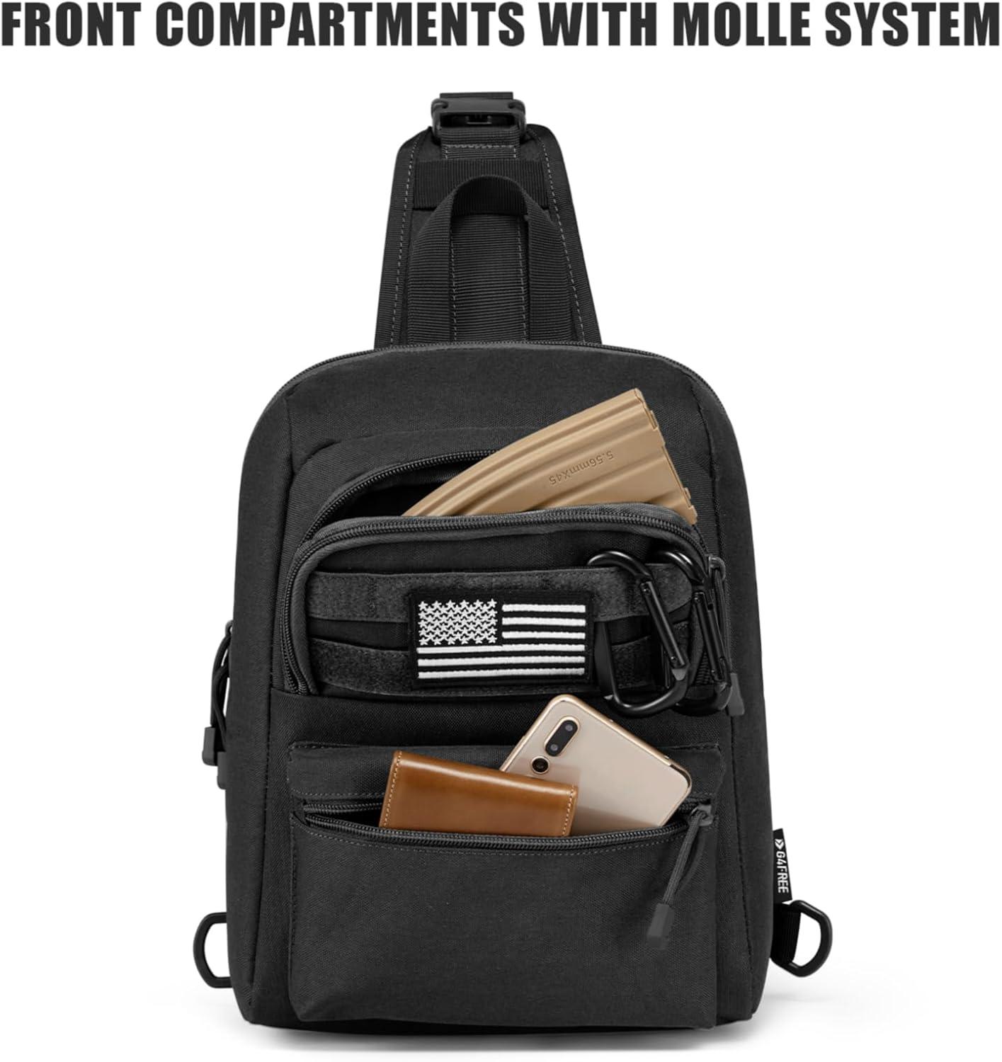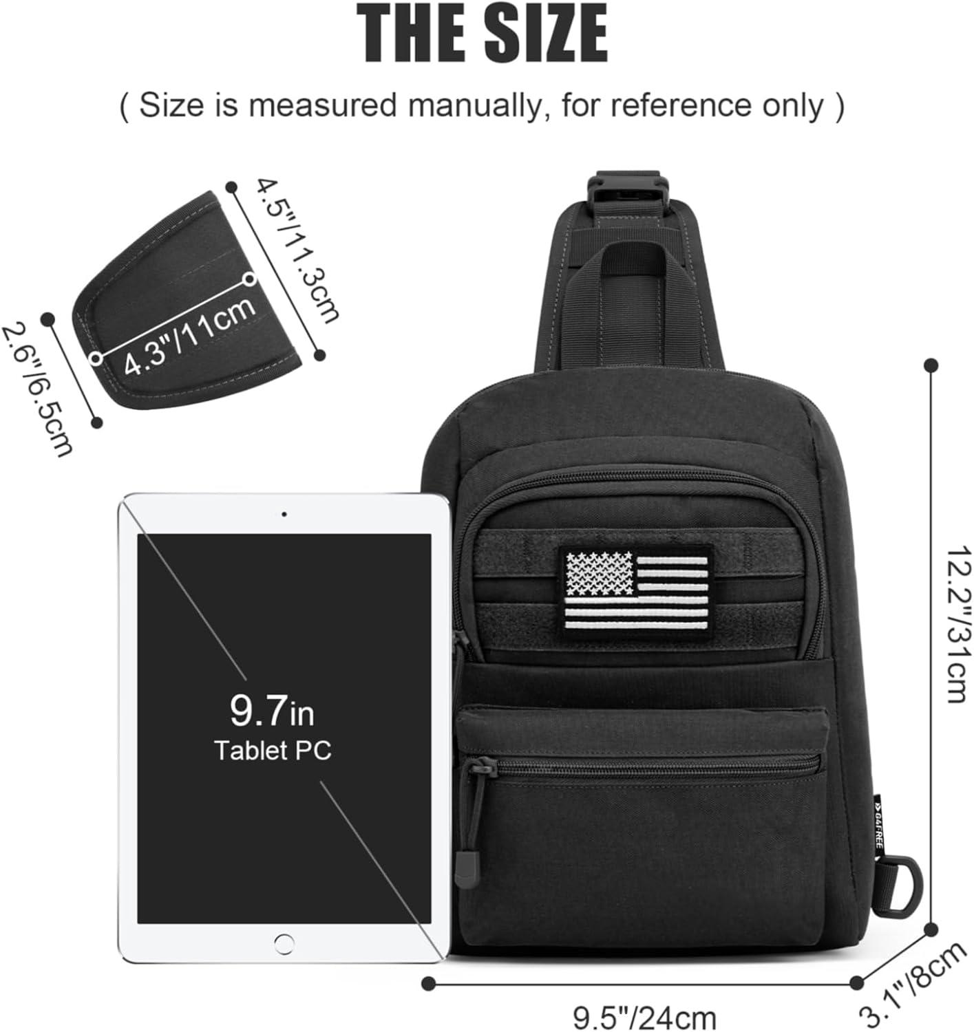 Multiple Compartments: The whole bag measures 12*9.5*3 inches, including 1 main compartment, 2 front pockets with a molle system, and 1 back pocket. Plenty of room for additional items such as a 9.7″ tablet, keys, wallet, phone, and other essentials.