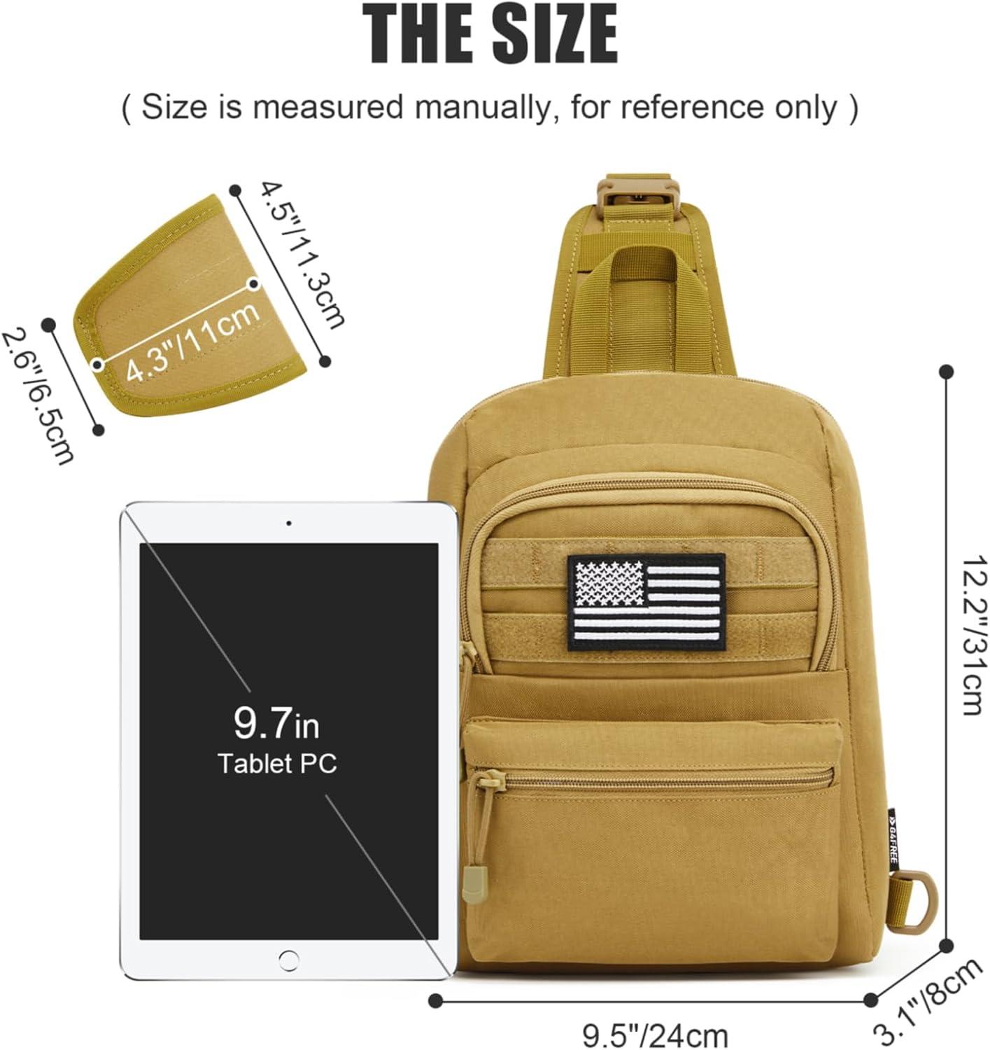 Multiple Compartments: The whole bag measures 12*9.5*3 inches, including 1 main compartment, 2 front pockets with a molle system, and 1 back pocket. Plenty of room for additional items such as a 9.7″ tablet, keys, wallet, phone, and other essentials.