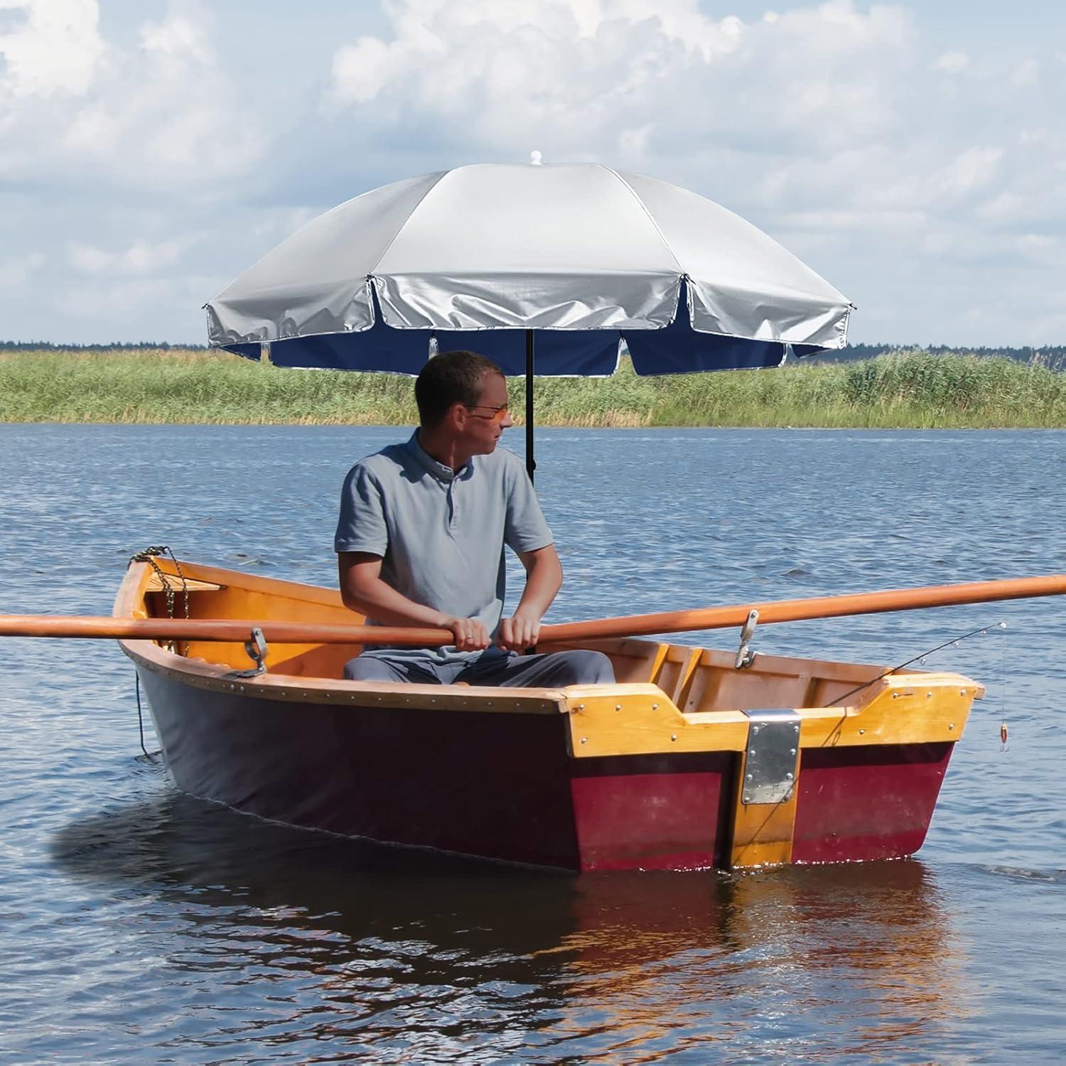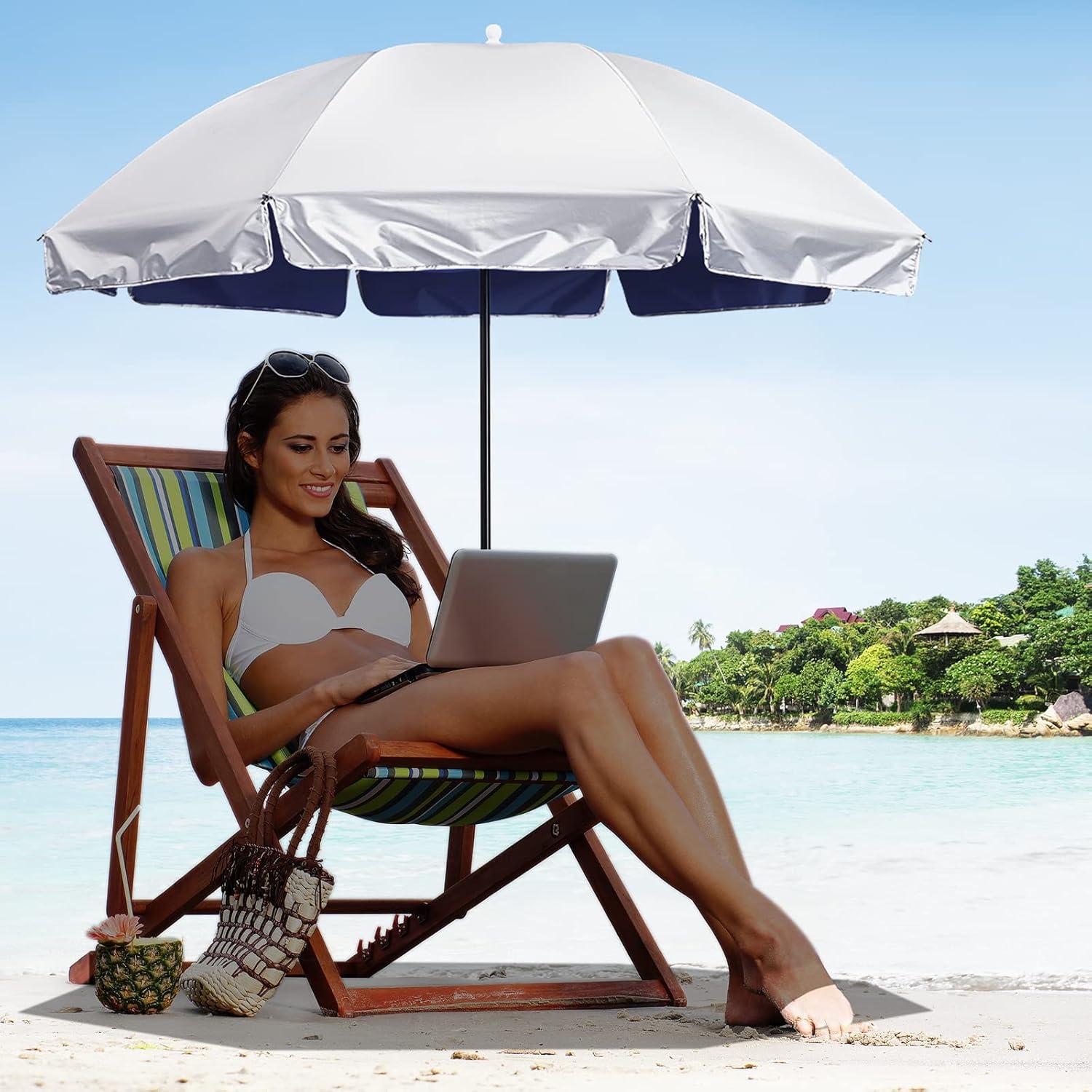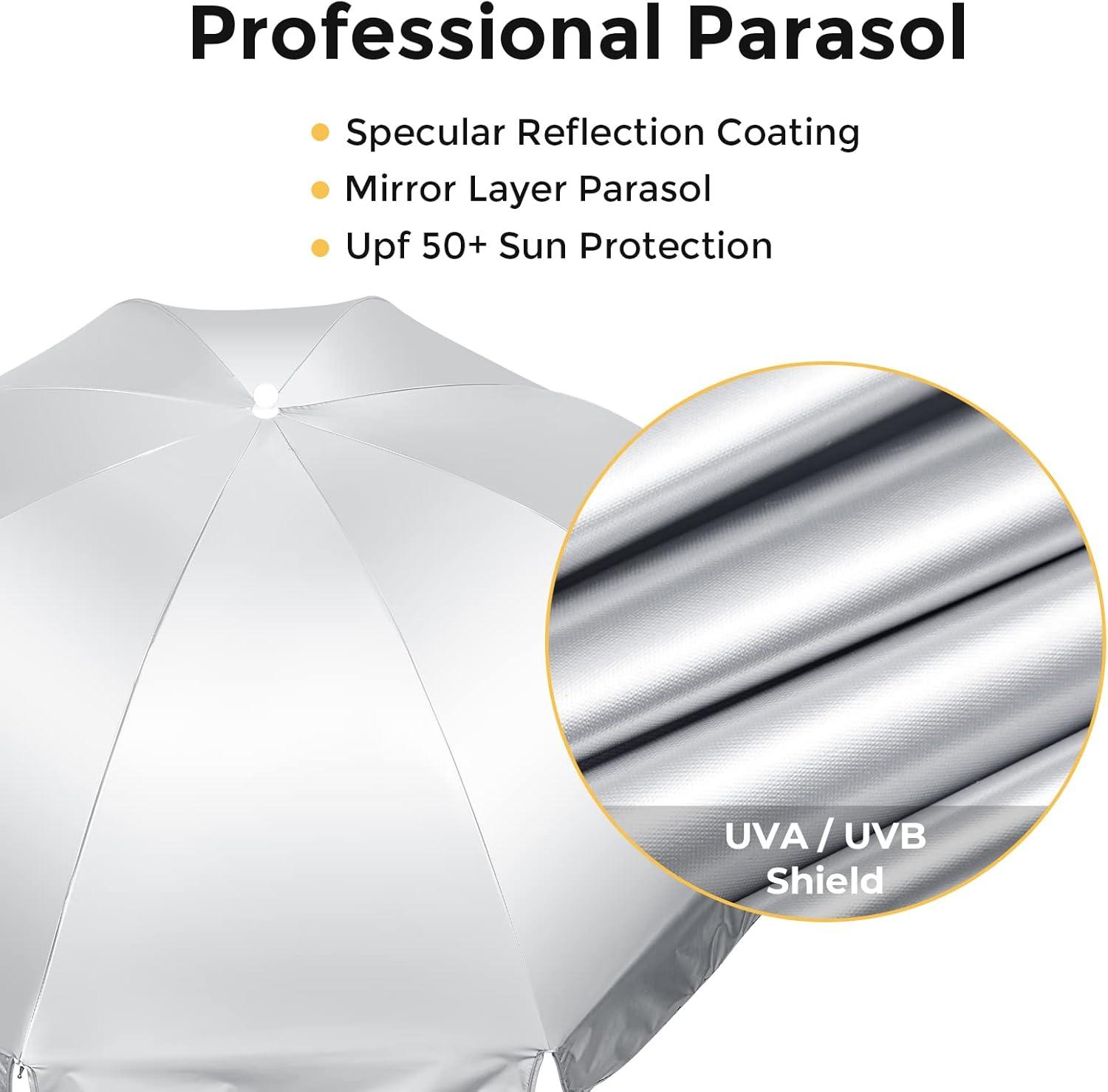 UPF 50+ UV Protection Umbrella. UPF 50+ high rating blocks 99% of UVA and UVB rays; the canopy is made of 100% polyester with a silver coating layer fabric, reflects heat to cool you down. This sun umbrella protects your skin and keeps you cool.