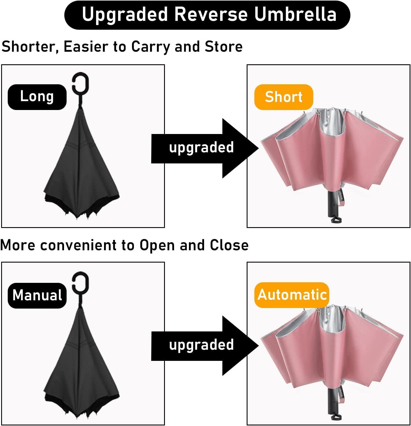 Inverted Folding Design: This upside-down umbrella takes an inside-out design. When you close it, the wet part will be inside of the umbrella, preventing water from dripping, and it will not get you wet when getting in and out of the car. You don't even need to worry about this automatic travel umbrella will wet your floor and mat.