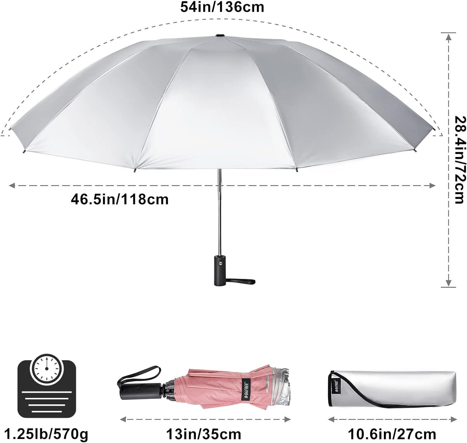 Large & Compact Travel Size: This compact UV umbrella is 54'' in arc canopy, 46.5'' in diameter, lightweight as 1.25 lb, can be collapsible to 13'', small size for easy storage in briefcases, backpacks, luggage, and more. The wrist loop is portable to take and it comes with an umbrella case to store.