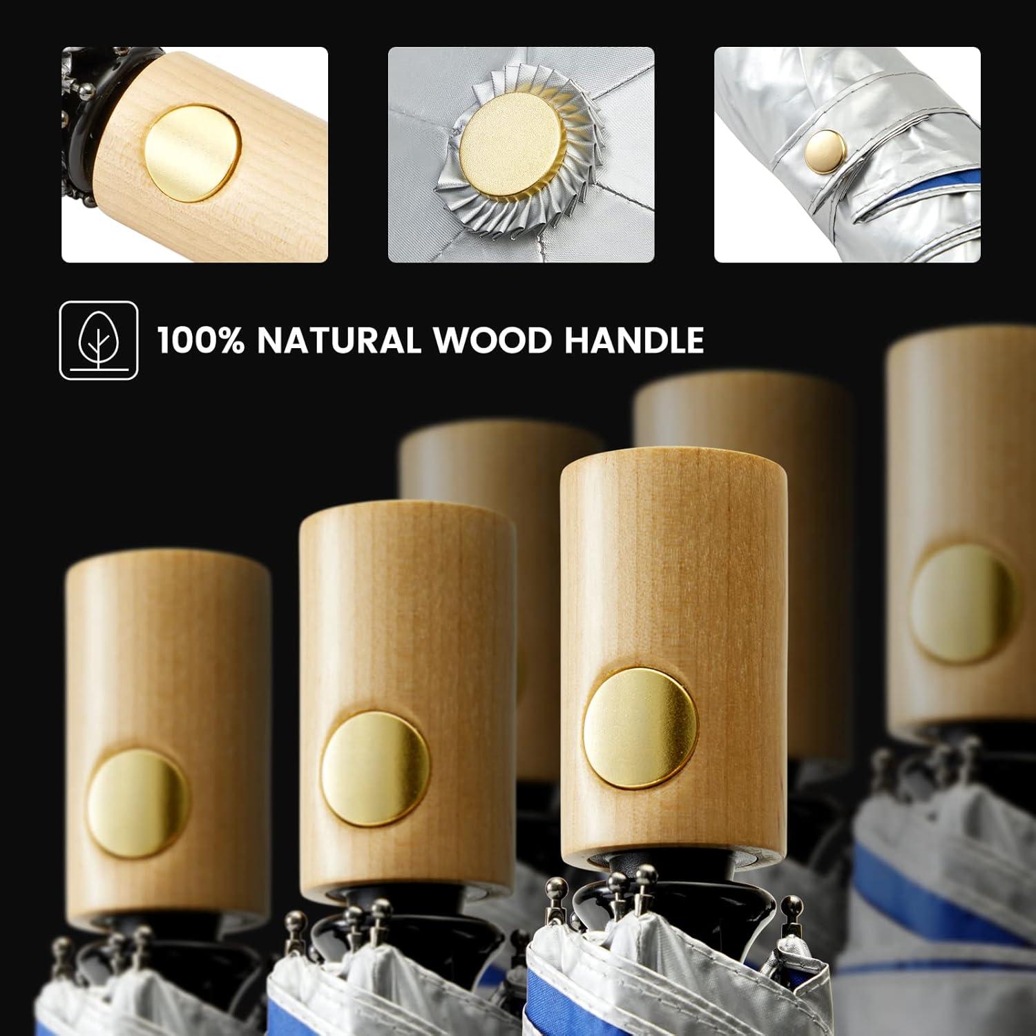 Automatic Open and Close Umbrella: Folding umbrella has auto open and close function, you don't need to fiddle with the umbrella when it is raining. The ergonomic umbrella wooden handle will provide comfortable holding and will complement the classic elegant look.
