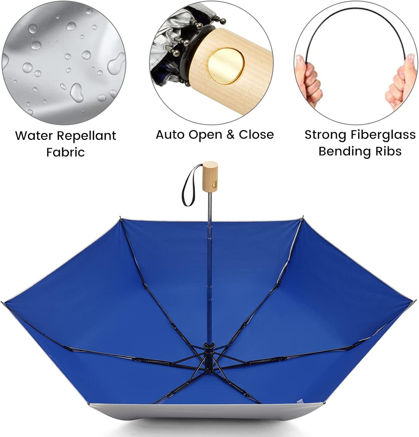 imageG4Free UPF 50 UV Protection Travel Umbrella with Wooden Handle 42 Inch Lightweight Sun Rain Folding Umbrellas Auto Open Close BlackBlue