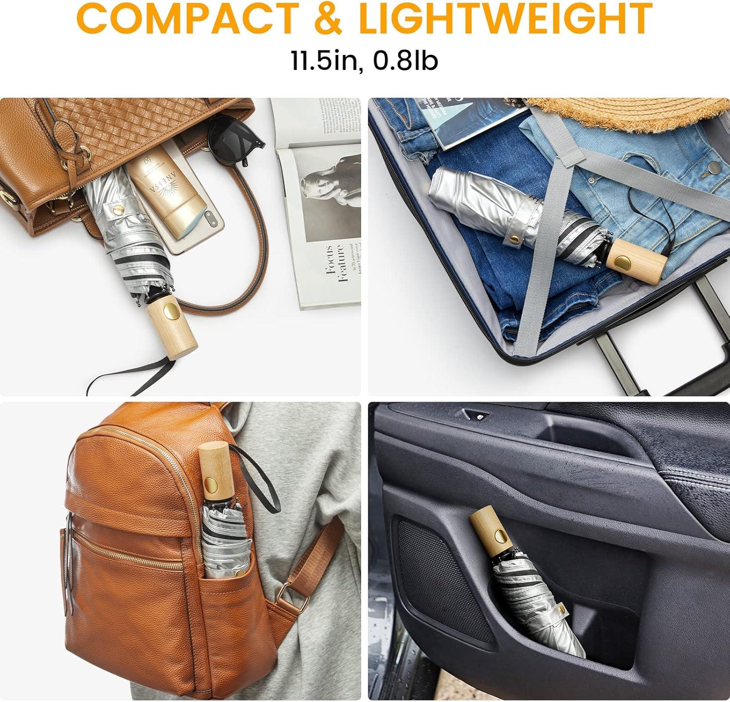 Compact Travel Size: This compact UV umbrella is 42 inch in arc canopy, 38.5 inch in diameter, and weighs 0.8lb. It can be folded to a small size to fit in a medium size purse and takes a small place. It is also lightweight and convenient to carry around.