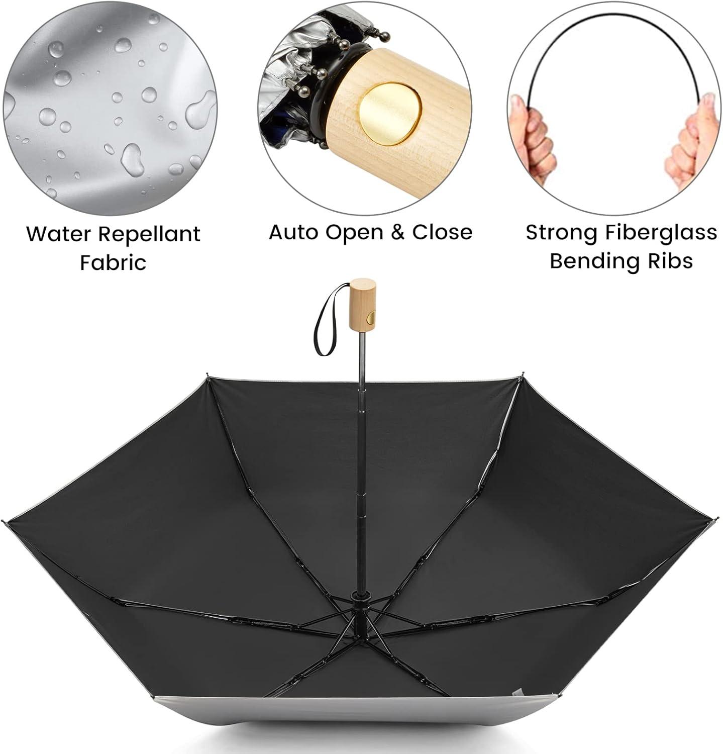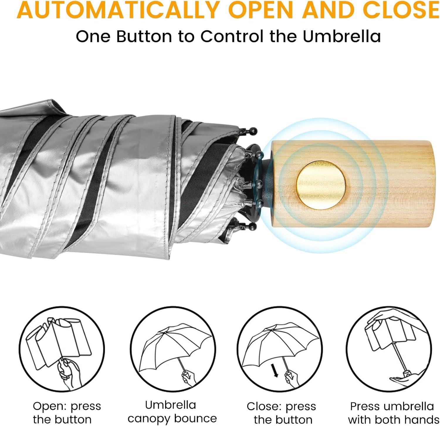 Automatic Open and Close Umbrella: Folding umbrella has auto open and close function, you don't need to fiddle with the umbrella when it is raining. The ergonomic umbrella wooden handle will provide comfortable holding and will complement the classic elegant look.