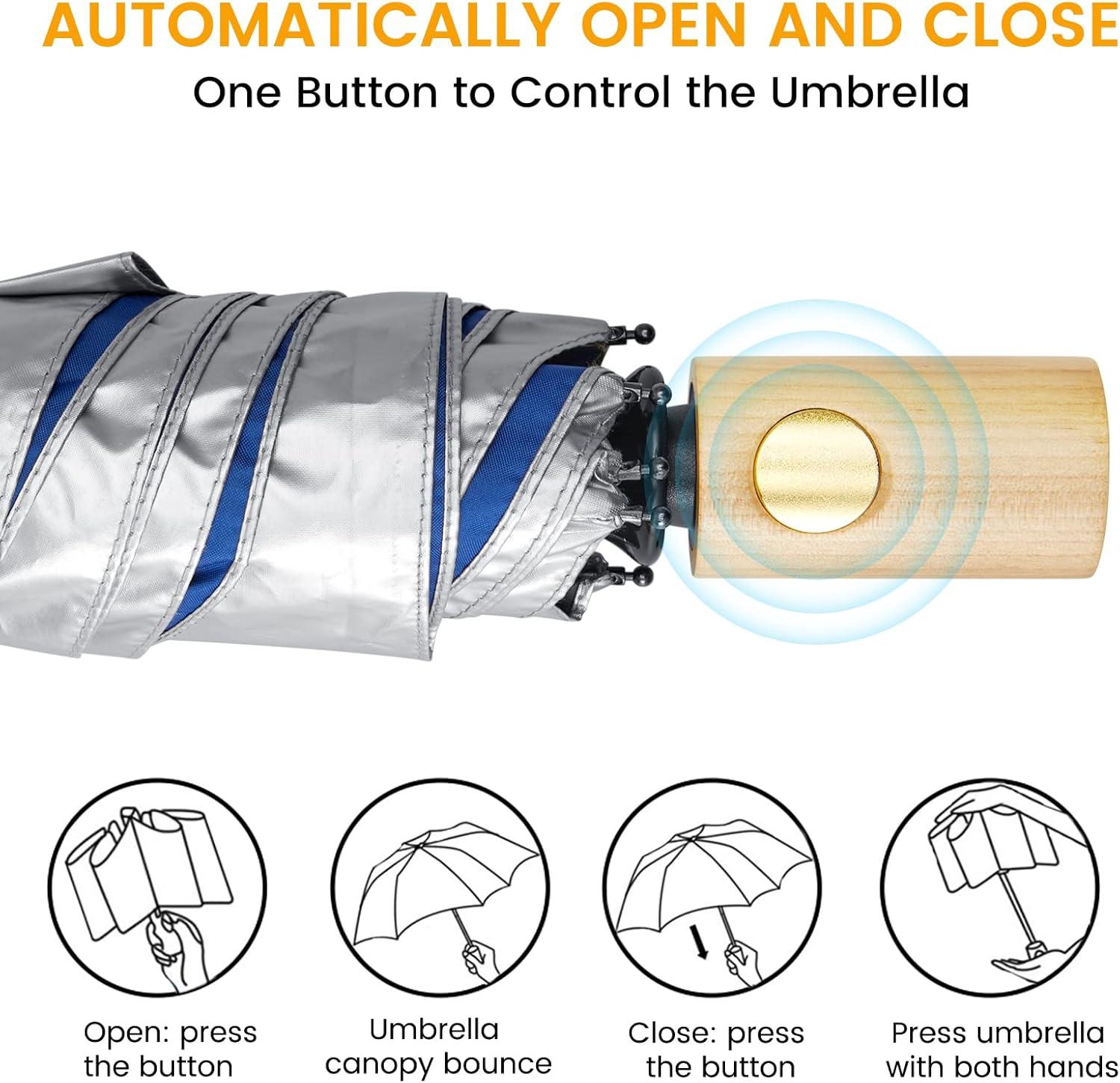 Automatic Open and Close Umbrella: Folding umbrella has auto open and close function, you don't need to fiddle with the umbrella when it is raining. The ergonomic umbrella wooden handle will provide comfortable holding and will complement the classic elegant look.