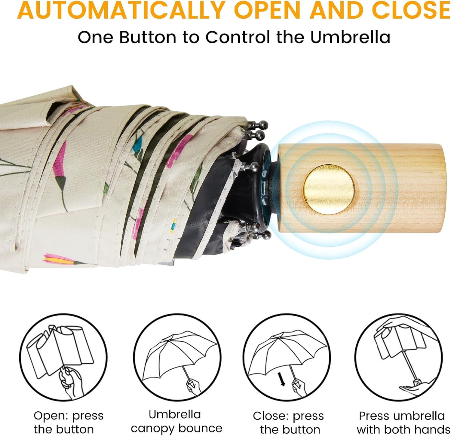Automatic Open and Close Umbrella: Folding umbrella has auto open and close function, you don't need to fiddle with the umbrella when it is raining. The ergonomic umbrella wooden handle will provide comfortable holding and will complement the classic elegant look.