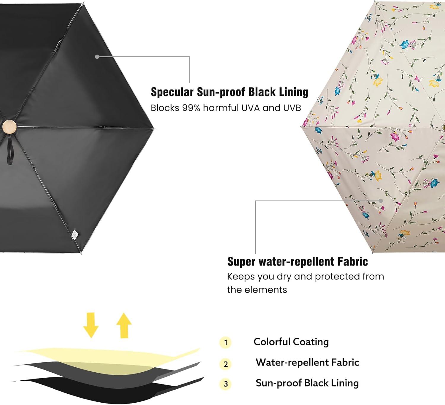 Compact Travel Size: This compact UV umbrella is 42 inch in arc canopy, 38.5 inch in diameter, and weighs 0.8lb. It can be folded to a small size to fit in a medium size purse and takes a small place. It is also lightweight and convenient to carry around.