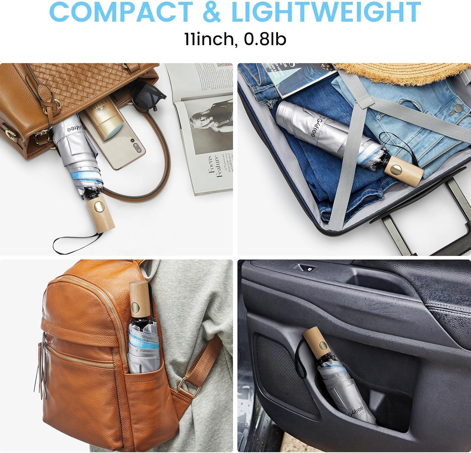Compact Travel Size: This compact UV umbrella is 42 inch in arc canopy, 38.5 inch in diameter, and weighs 0.8lb. It can be folded to a small size to fit in a medium size purse and takes a small place. It is also lightweight and convenient to carry around.