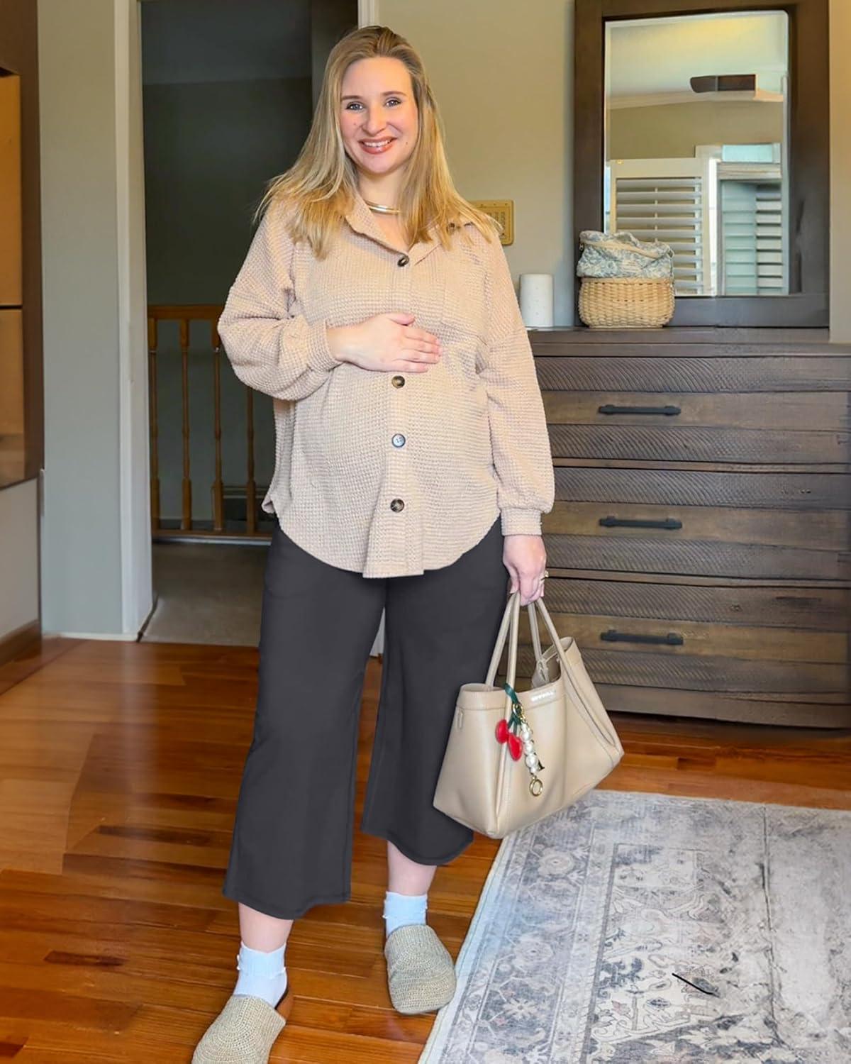 G4Free Wide Leg Maternity Yoga Capris Over The Belly Stretch Pregnancy Cropped Pants with Pockets(Dark Gray)