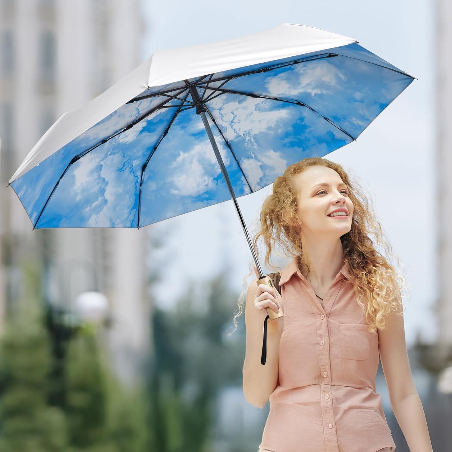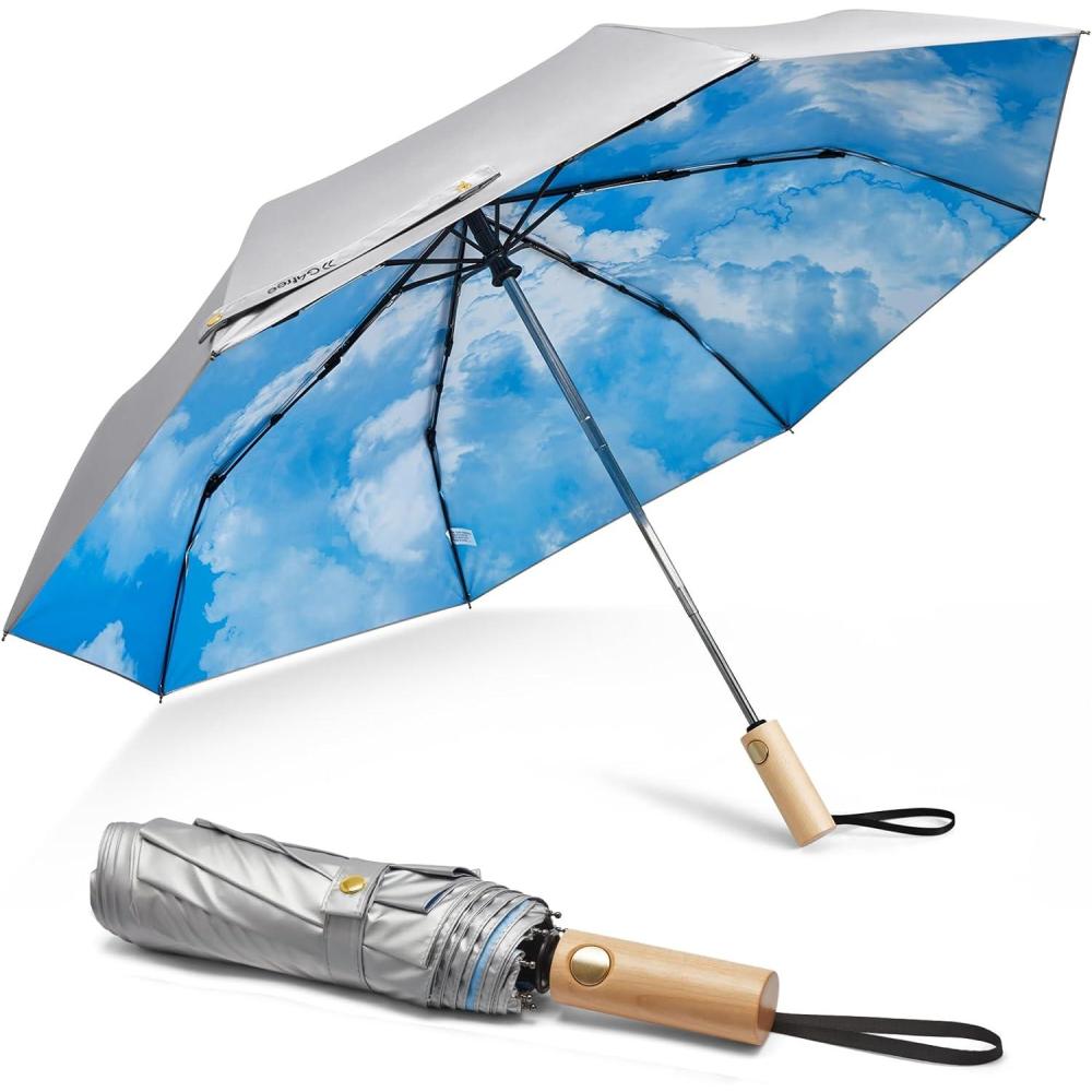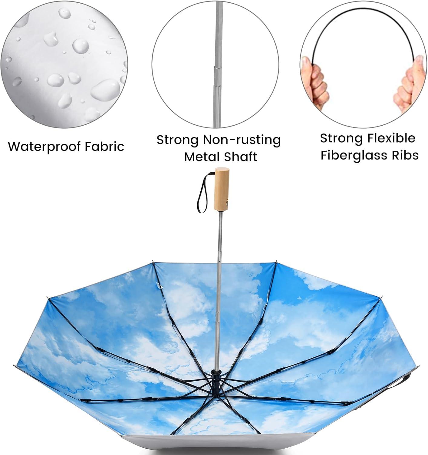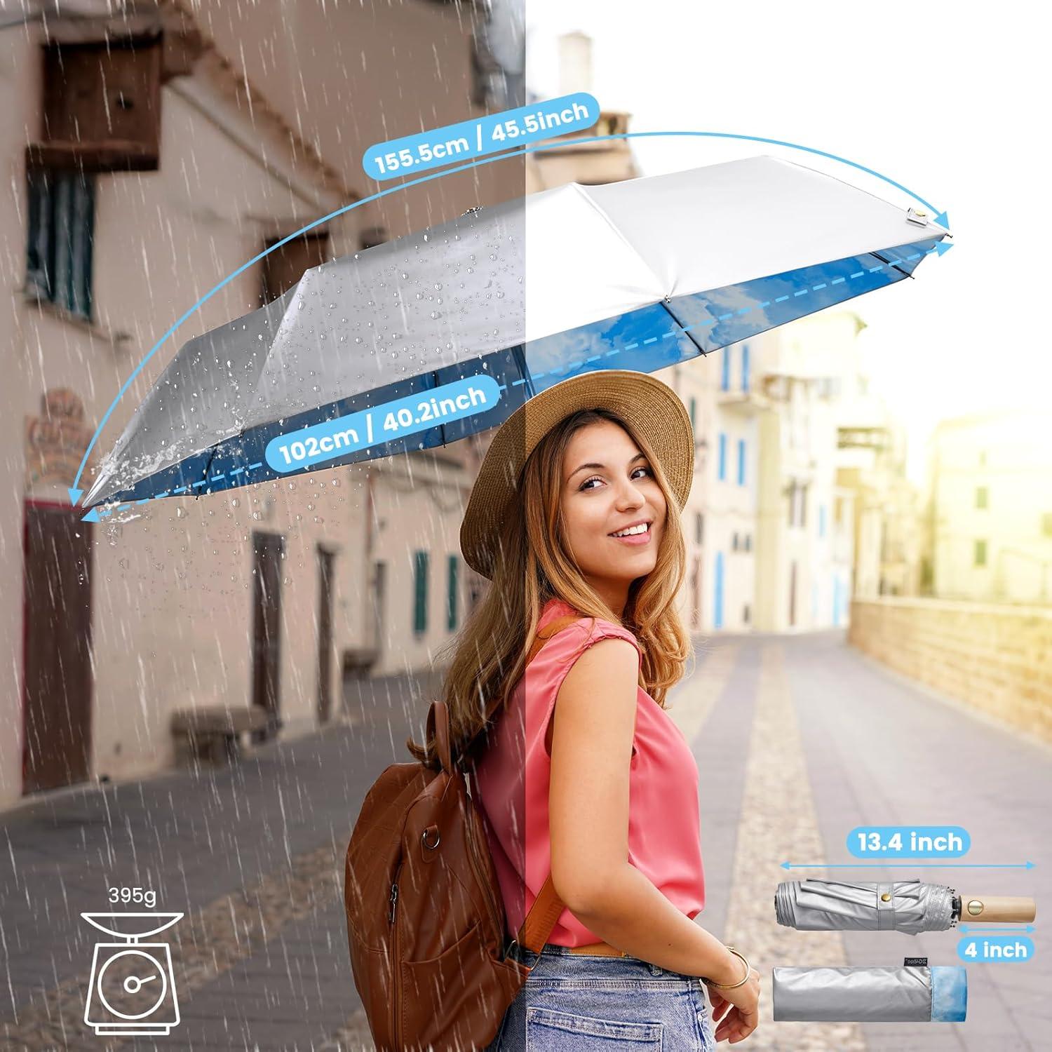 G4Free Windproof Travel Umbrella with Large Wooden Handle, UV Sun Protection & Rain Umbrella Automatic Open And Close, Compact 46" Large Canopy with UPF 50+, Lightweight Portable for Walking & Outdoor(Silver/Sky)