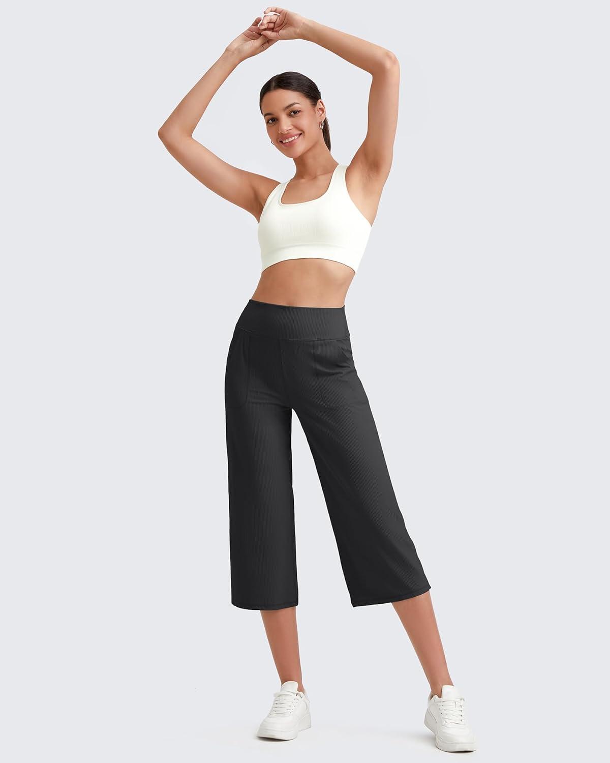 G4Free Women's Ribbed Wide Leg Yoga Capri Pants High Waist Summer Lightweight Loose Cropped Pants with Pockets(Black)