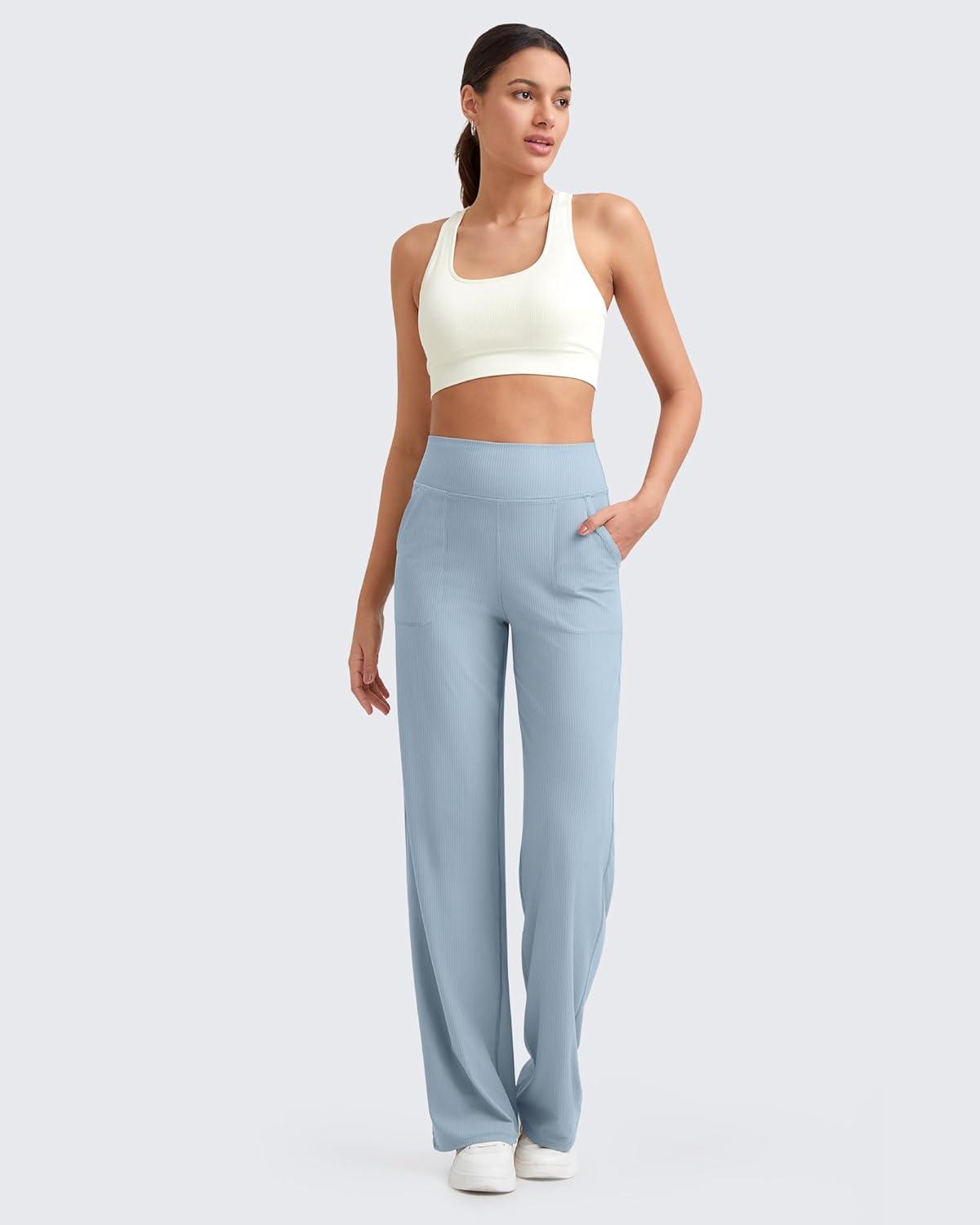 G4Free Womne's Ribbed Knit Wide Leg Pants with Pockets Lightweight Stretchy Yoga Pants Casual Lounge(Blue Willow)