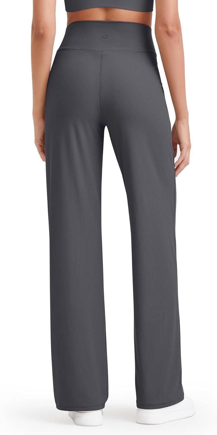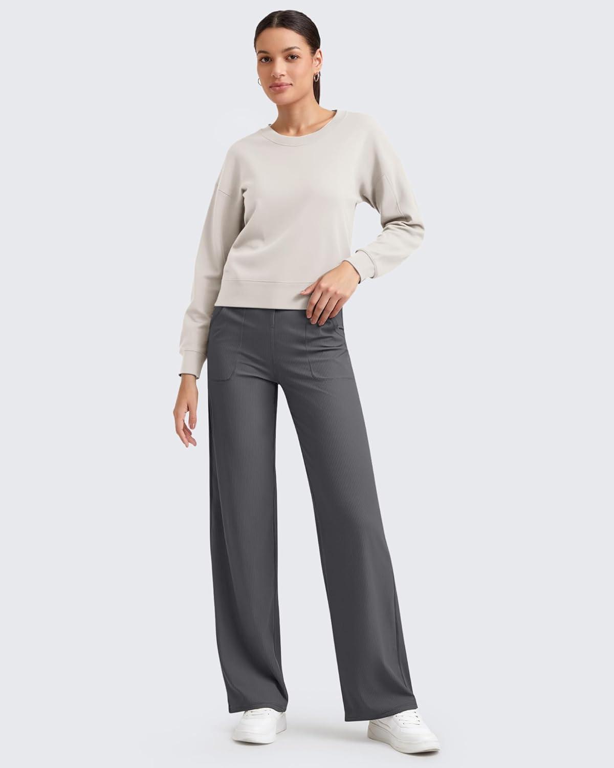 G4Free Womne’s Ribbed Knit Wide Leg Pants with Pockets Lightweight Stretchy Yoga Pants Casual Lounge(Dark Gray)