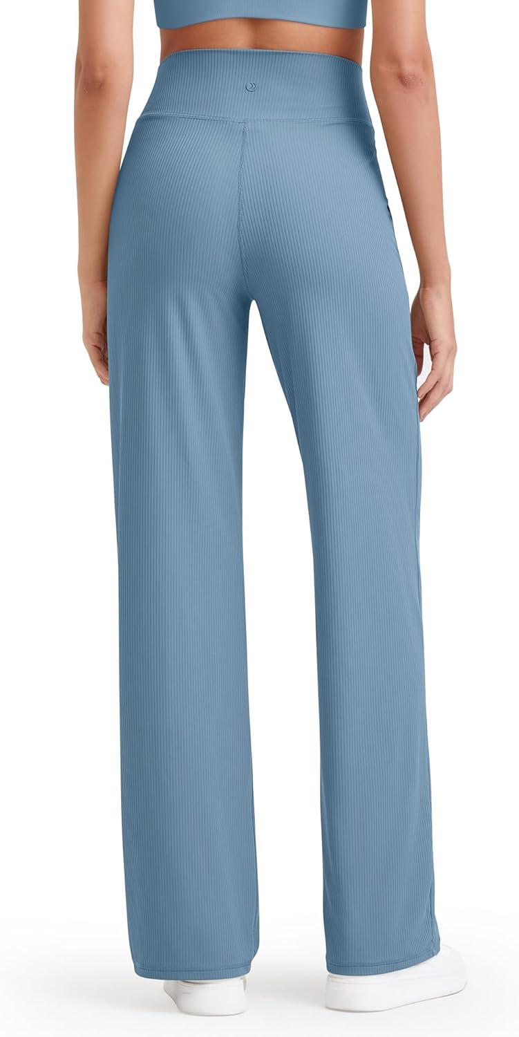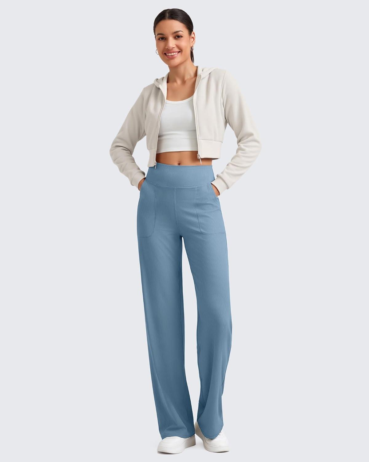 G4Free Womne's Ribbed Knit Wide Leg Pants with Pockets Lightweight Stretchy Yoga Pants Casual Lounge(Dusty Blue)