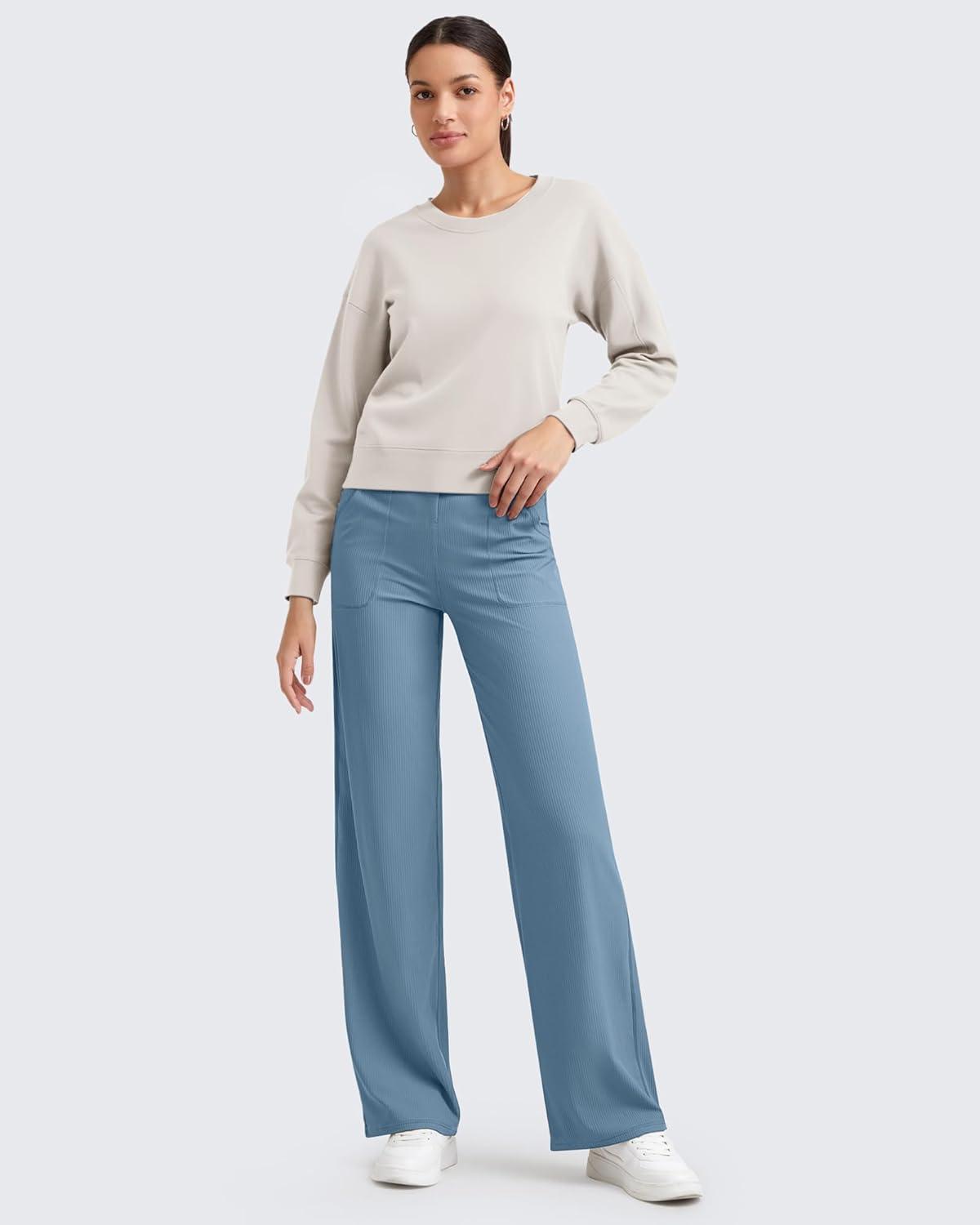 G4Free Womne’s Ribbed Knit Wide Leg Pants with Pockets Lightweight Stretchy Yoga Pants Casual Lounge(Dusty Blue)